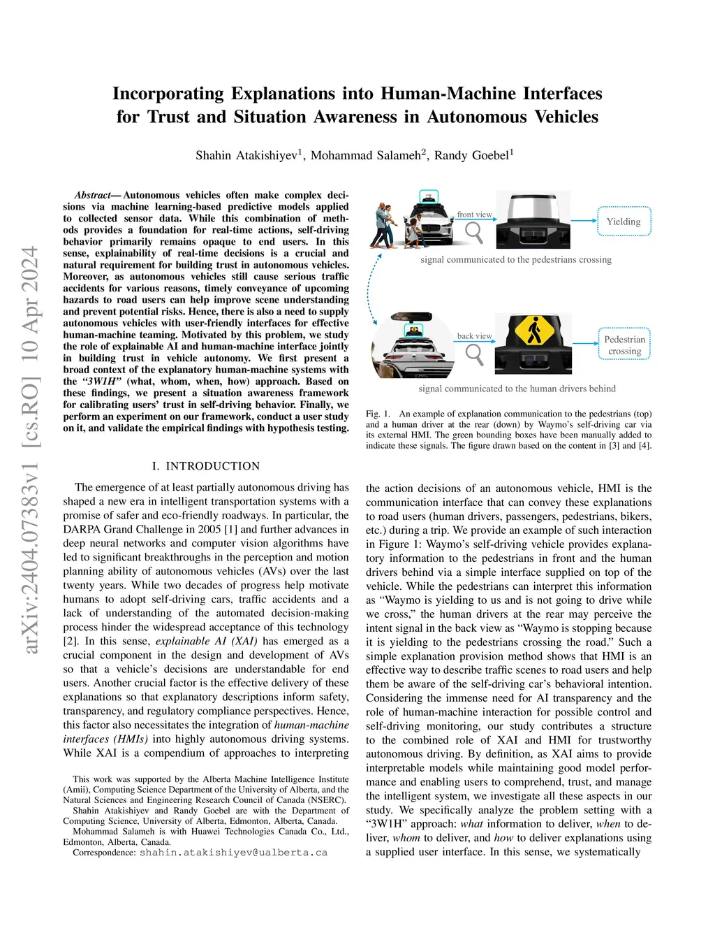 Autonomous vehicles often make complex decisions via machine learning-based predictive models applied to collected sensor data. While this combination of methods provides a foundation for real-time actions, self-driving behavior primarily remains opaque to end users. In this sense, explainability of real-time decisions is a crucial and natural requirement for building trust in autonomous vehicles. Moreover, as autonomous vehicles still cause serious traffic accidents for various reasons, timely conveyance of upcoming hazards to road users can help improve scene understanding and prevent potential risks. Hence, there is also a need to supply autonomous vehicles with user-friendly interfaces for effective human-machine teaming. Motivated by this problem, we study the role of explainable AI and human-machine interface jointly in building trust in vehicle autonomy. We first present a broad context of the explanatory human-machine systems with the "3W1H" (what, whom, when, how) approach. Based on these findings, we present a situation awareness framework for calibrating users' trust in self-driving behavior. Finally, we perform an experiment on our framework, conduct a user study on it, and validate the empirical findings with hypothesis testing.
