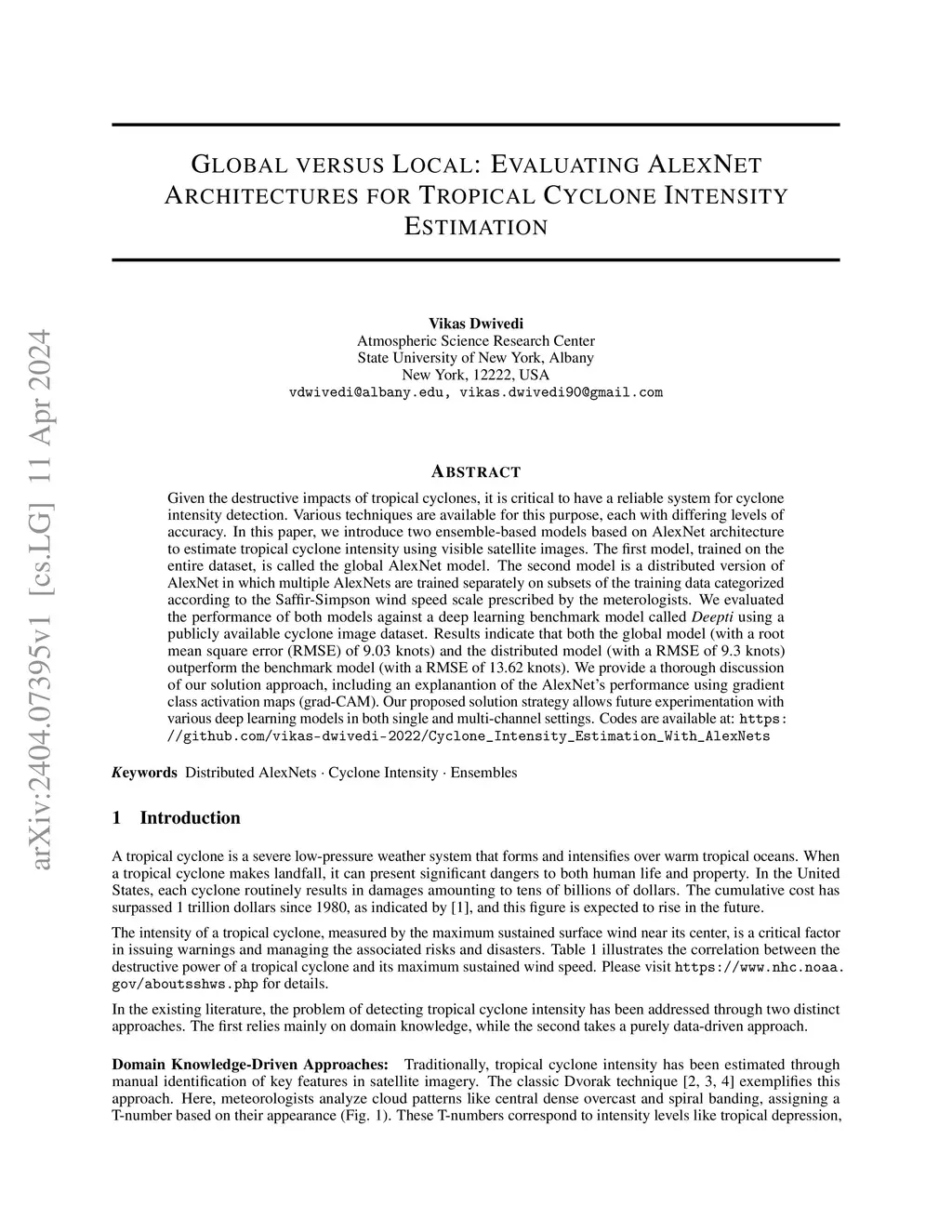 Given the destructive impacts of tropical cyclones, it is critical to have a reliable system for cyclone intensity detection. Various techniques are available for this purpose, each with differing levels of accuracy. In this paper, we introduce two ensemble-based models based on AlexNet architecture to estimate tropical cyclone intensity using visible satellite images. The first model, trained on the entire dataset, is called the global AlexNet model. The second model is a distributed version of AlexNet in which multiple AlexNets are trained separately on subsets of the training data categorized according to the Saffir-Simpson wind speed scale prescribed by the meterologists. We evaluated the performance of both models against a deep learning benchmark model called \textit{Deepti} using a publicly available cyclone image dataset. Results indicate that both the global model (with a root mean square error (RMSE) of 9.03 knots) and the distributed model (with a RMSE of 9.3 knots) outperform the benchmark model (with a RMSE of 13.62 knots). We provide a thorough discussion of our solution approach, including an explanantion of the AlexNet's performance using gradient class activation maps (grad-CAM). Our proposed solution strategy allows future experimentation with various deep learning models in both single and multi-channel settings.