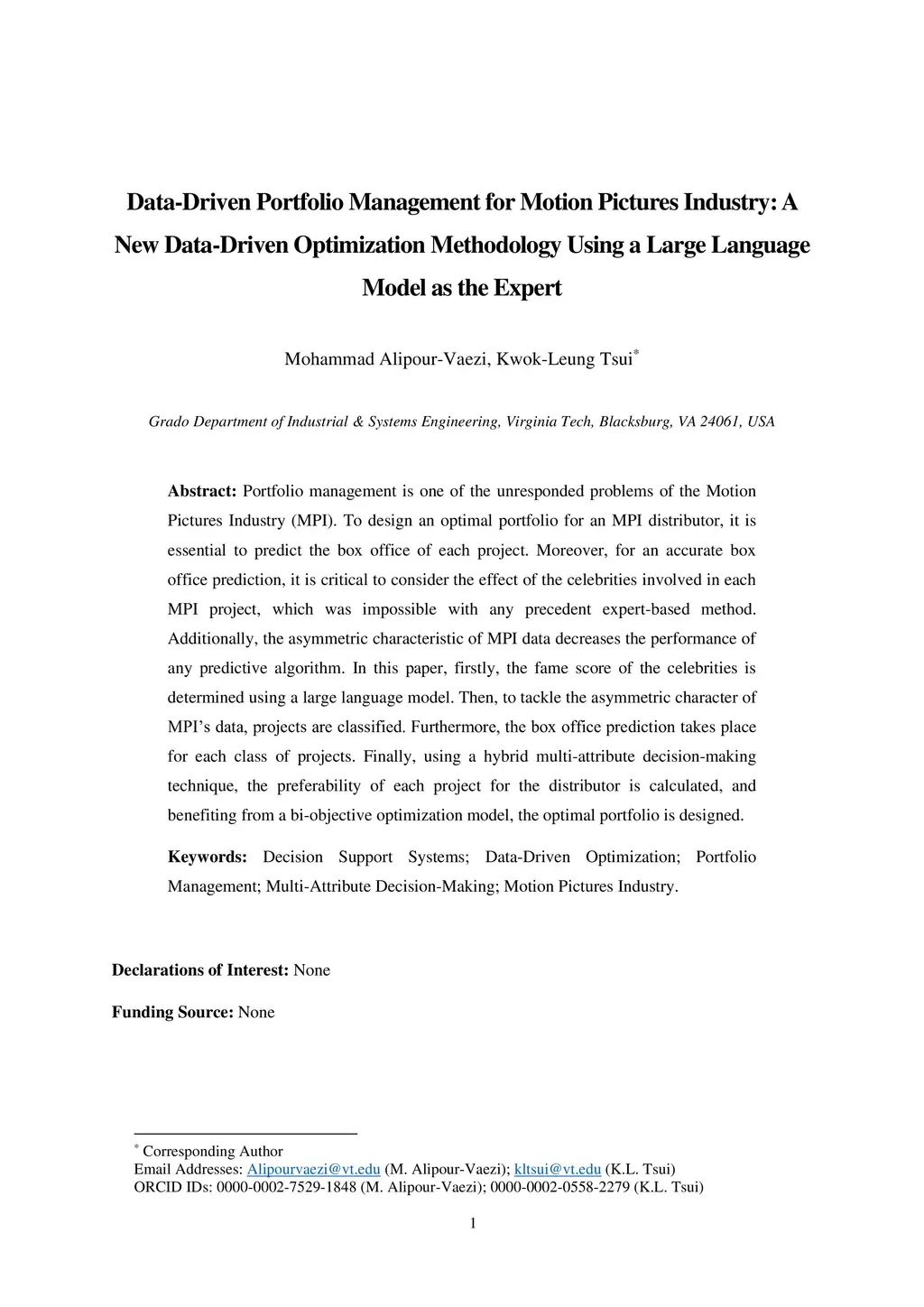 Portfolio management is one of the unresponded problems of the Motion Pictures Industry (MPI). To design an optimal portfolio for an MPI distributor, it is essential to predict the box office of each project. Moreover, for an accurate box office prediction, it is critical to consider the effect of the celebrities involved in each MPI project, which was impossible with any precedent expert-based method. Additionally, the asymmetric characteristic of MPI data decreases the performance of any predictive algorithm. In this paper, firstly, the fame score of the celebrities is determined using a large language model. Then, to tackle the asymmetric character of MPI's data, projects are classified. Furthermore, the box office prediction takes place for each class of projects. Finally, using a hybrid multi-attribute decision-making technique, the preferability of each project for the distributor is calculated, and benefiting from a bi-objective optimization model, the optimal portfolio is designed.