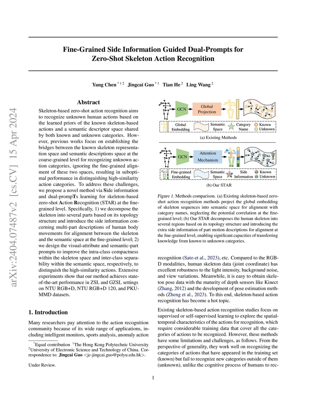 Skeleton-based zero-shot action recognition aims to recognize unknown human actions based on the learned priors of the known skeleton-based actions and a semantic descriptor space shared by both known and unknown categories. However, previous works focus on establishing the bridges between the known skeleton representation space and semantic descriptions space at the coarse-grained level for recognizing unknown action categories, ignoring the fine-grained alignment of these two spaces, resulting in suboptimal performance in distinguishing high-similarity action categories. To address these challenges, we propose a novel method via Side information and dual-prompts learning for skeleton-based zero-shot action recognition (STAR) at the fine-grained level. Specifically, 1) we decompose the skeleton into several parts based on its topology structure and introduce the side information concerning multi-part descriptions of human body movements for alignment between the skeleton and the semantic space at the fine-grained level; 2) we design the visual-attribute and semantic-part prompts to improve the intra-class compactness within the skeleton space and inter-class separability within the semantic space, respectively, to distinguish the high-similarity actions. Extensive experiments show that our method achieves state-of-the-art performance in ZSL and GZSL settings on NTU RGB+D, NTU RGB+D 120, and PKU-MMD datasets.