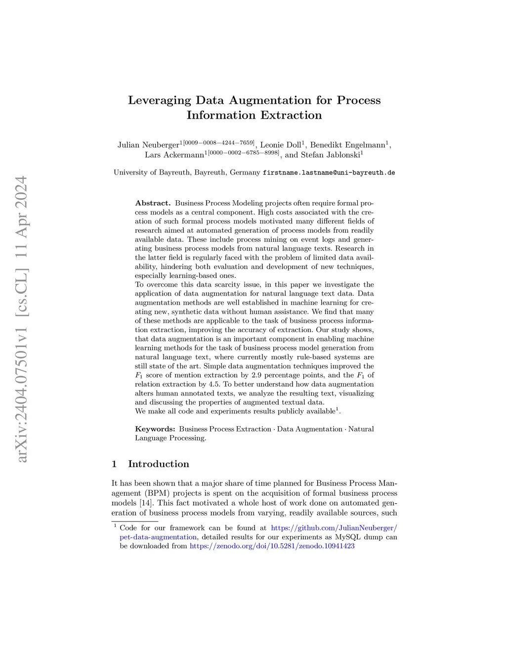 Business Process Modeling projects often require formal process models as a central component. High costs associated with the creation of such formal process models motivated many different fields of research aimed at automated generation of process models from readily available data. These include process mining on event logs, and generating business process models from natural language texts. Research in the latter field is regularly faced with the problem of limited data availability, hindering both evaluation and development of new techniques, especially learning-based ones. To overcome this data scarcity issue, in this paper we investigate the application of data augmentation for natural language text data. Data augmentation methods are well established in machine learning for creating new, synthetic data without human assistance. We find that many of these methods are applicable to the task of business process information extraction, improving the accuracy of extraction. Our study shows, that data augmentation is an important component in enabling machine learning methods for the task of business process model generation from natural language text, where currently mostly rule-based systems are still state of the art. Simple data augmentation techniques improved the score of mention extraction by 2.9 percentage points, and the of relation extraction by . To better understand how data augmentation alters human annotated texts, we analyze the resulting text, visualizing and discussing the properties of augmented textual data. We make all code and experiments results publicly available.