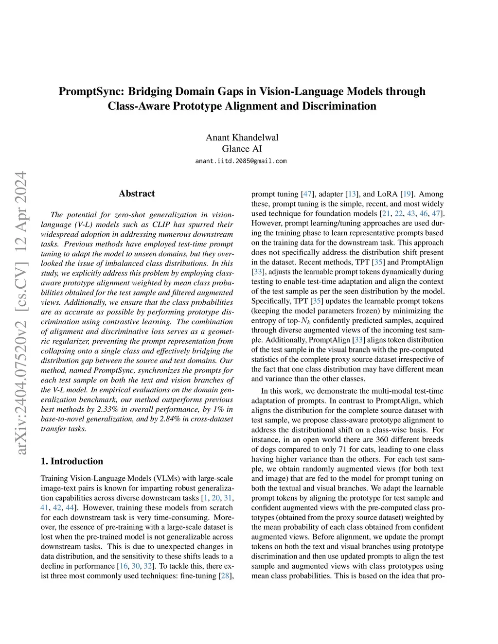 The potential for zero-shot generalization in vision-language (V-L) models such as CLIP has spurred their widespread adoption in addressing numerous downstream tasks. Previous methods have employed test-time prompt tuning to adapt the model to unseen domains, but they overlooked the issue of imbalanced class distributions. In this study, we explicitly address this problem by employing class-aware prototype alignment weighted by mean class probabilities obtained for the test sample and filtered augmented views. Additionally, we ensure that the class probabilities are as accurate as possible by performing prototype discrimination using contrastive learning. The combination of alignment and discriminative loss serves as a geometric regularizer, preventing the prompt representation from collapsing onto a single class and effectively bridging the distribution gap between the source and test domains. Our method, named PromptSync, synchronizes the prompts for each test sample on both the text and vision branches of the V-L model. In empirical evaluations on the domain generalization benchmark, our method outperforms previous best methods by 2.33% in overall performance, by 1% in base-to-novel generalization, and by 2.84% in cross-dataset transfer tasks.