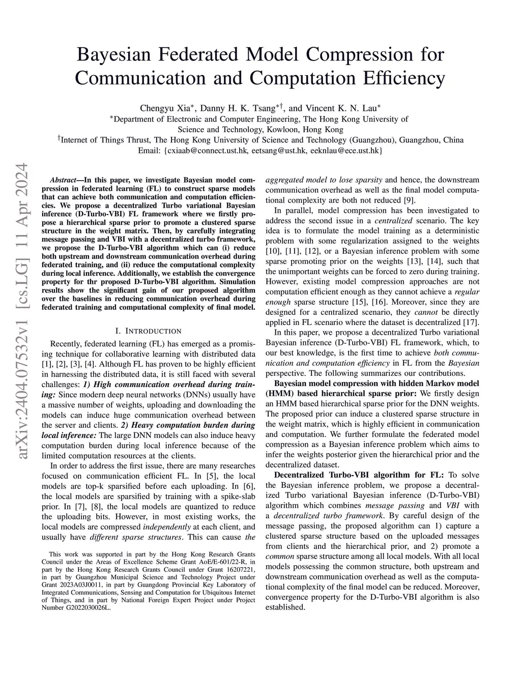 In this paper, we investigate Bayesian model compression in federated learning (FL) to construct sparse models that can achieve both communication and computation efficiencies. We propose a decentralized Turbo variational Bayesian inference (D-Turbo-VBI) FL framework where we firstly propose a hierarchical sparse prior to promote a clustered sparse structure in the weight matrix. Then, by carefully integrating message passing and VBI with a decentralized turbo framework, we propose the D-Turbo-VBI algorithm which can (i) reduce both upstream and downstream communication overhead during federated training, and (ii) reduce the computational complexity during local inference. Additionally, we establish the convergence property for thr proposed D-Turbo-VBI algorithm. Simulation results show the significant gain of our proposed algorithm over the baselines in reducing communication overhead during federated training and computational complexity of final model.