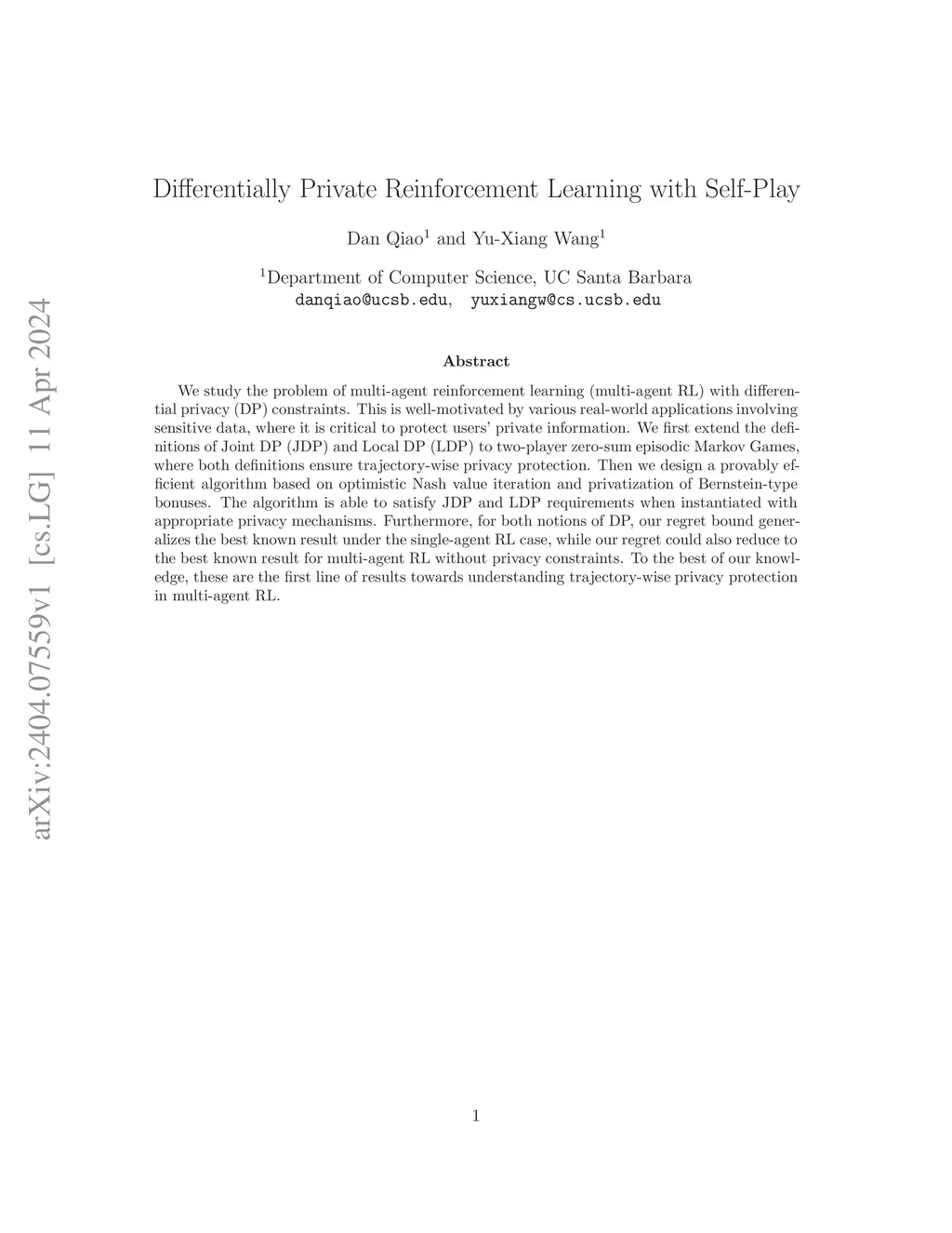 We study the problem of multi-agent reinforcement learning (multi-agent RL) with differential privacy (DP) constraints. This is well-motivated by various real-world applications involving sensitive data, where it is critical to protect users' private information. We first extend the definitions of Joint DP (JDP) and Local DP (LDP) to two-player zero-sum episodic Markov Games, where both definitions ensure trajectory-wise privacy protection. Then we design a provably efficient algorithm based on optimistic Nash value iteration and privatization of Bernstein-type bonuses. The algorithm is able to satisfy JDP and LDP requirements when instantiated with appropriate privacy mechanisms. Furthermore, for both notions of DP, our regret bound generalizes the best known result under the single-agent RL case, while our regret could also reduce to the best known result for multi-agent RL without privacy constraints. To the best of our knowledge, these are the first line of results towards understanding trajectory-wise privacy protection in multi-agent RL.