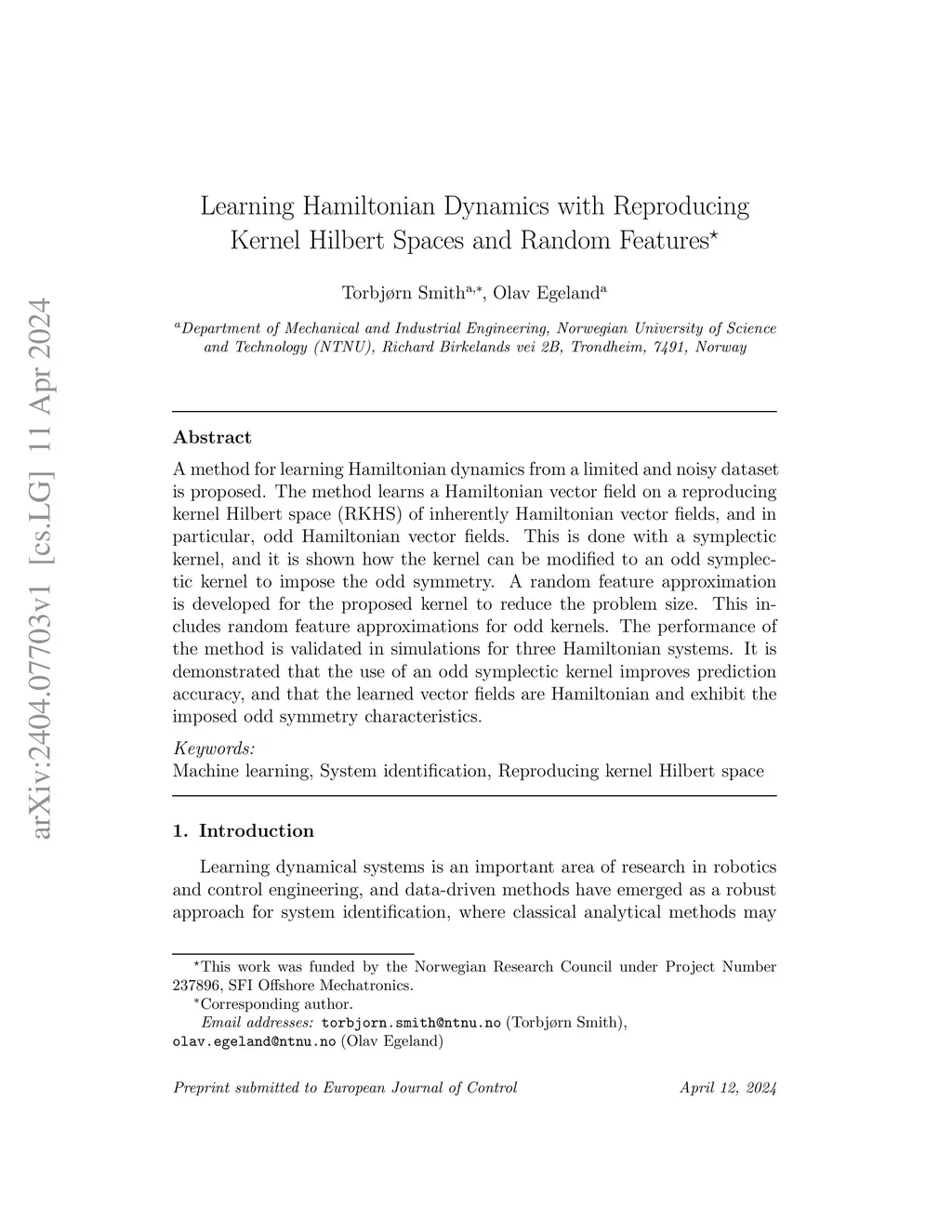 A method for learning Hamiltonian dynamics from a limited and noisy dataset is proposed. The method learns a Hamiltonian vector field on a reproducing kernel Hilbert space (RKHS) of inherently Hamiltonian vector fields, and in particular, odd Hamiltonian vector fields. This is done with a symplectic kernel, and it is shown how the kernel can be modified to an odd symplectic kernel to impose the odd symmetry. A random feature approximation is developed for the proposed kernel to reduce the problem size. This includes random feature approximations for odd kernels. The performance of the method is validated in simulations for three Hamiltonian systems. It is demonstrated that the use of an odd symplectic kernel improves prediction accuracy, and that the learned vector fields are Hamiltonian and exhibit the imposed odd symmetry characteristics.