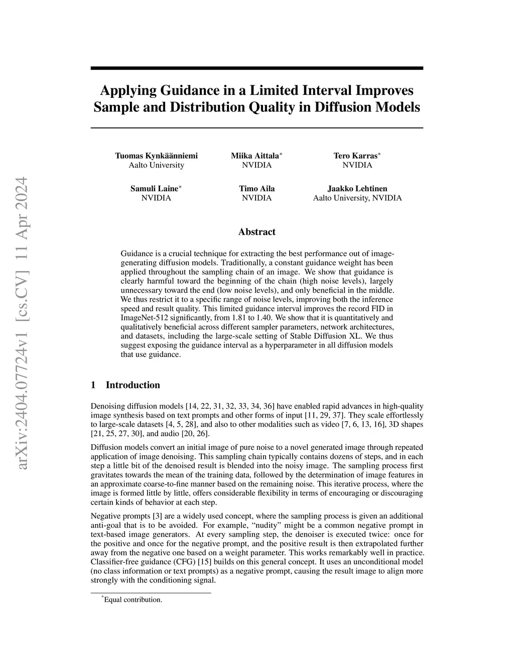 Guidance is a crucial technique for extracting the best performance out of image-generating diffusion models. Traditionally, a constant guidance weight has been applied throughout the sampling chain of an image. We show that guidance is clearly harmful toward the beginning of the chain (high noise levels), largely unnecessary toward the end (low noise levels), and only beneficial in the middle. We thus restrict it to a specific range of noise levels, improving both the inference speed and result quality. This limited guidance interval improves the record FID in ImageNet-512 significantly, from 1.81 to 1.40. We show that it is quantitatively and qualitatively beneficial across different sampler parameters, network architectures, and datasets, including the large-scale setting of Stable Diffusion XL. We thus suggest exposing the guidance interval as a hyperparameter in all diffusion models that use guidance.