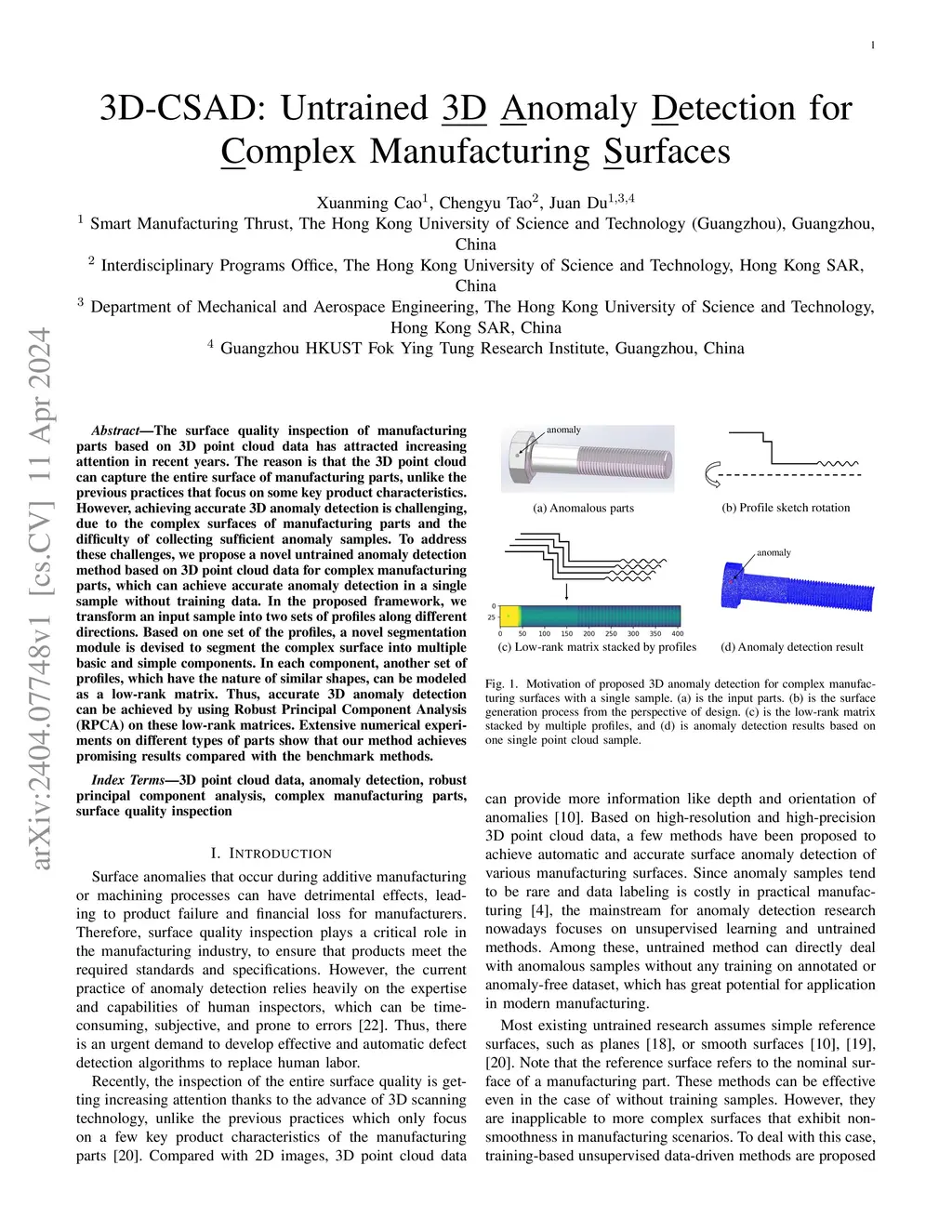 The surface quality inspection of manufacturing parts based on 3D point cloud data has attracted increasing attention in recent years. The reason is that the 3D point cloud can capture the entire surface of manufacturing parts, unlike the previous practices that focus on some key product characteristics. However, achieving accurate 3D anomaly detection is challenging, due to the complex surfaces of manufacturing parts and the difficulty of collecting sufficient anomaly samples. To address these challenges, we propose a novel untrained anomaly detection method based on 3D point cloud data for complex manufacturing parts, which can achieve accurate anomaly detection in a single sample without training data. In the proposed framework, we transform an input sample into two sets of profiles along different directions. Based on one set of the profiles, a novel segmentation module is devised to segment the complex surface into multiple basic and simple components. In each component, another set of profiles, which have the nature of similar shapes, can be modeled as a low-rank matrix. Thus, accurate 3D anomaly detection can be achieved by using Robust Principal Component Analysis (RPCA) on these low-rank matrices. Extensive numerical experiments on different types of parts show that our method achieves promising results compared with the benchmark methods.