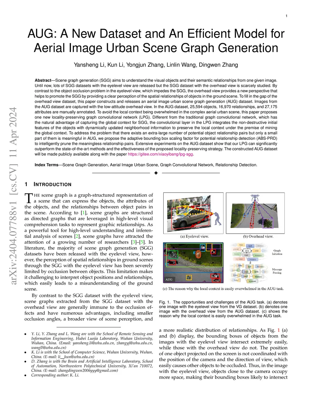 Scene graph generation (SGG) aims to understand the visual objects and their semantic relationships from one given image. Until now, lots of SGG datasets with the eyelevel view are released but the SGG dataset with the overhead view is scarcely studied. By contrast to the object occlusion problem in the eyelevel view, which impedes the SGG, the overhead view provides a new perspective that helps to promote the SGG by providing a clear perception of the spatial relationships of objects in the ground scene. To fill in the gap of the overhead view dataset, this paper constructs and releases an aerial image urban scene graph generation (AUG) dataset. Images from the AUG dataset are captured with the low-attitude overhead view. In the AUG dataset, 25,594 objects, 16,970 relationships, and 27,175 attributes are manually annotated. To avoid the local context being overwhelmed in the complex aerial urban scene, this paper proposes one new locality-preserving graph convolutional network (LPG). Different from the traditional graph convolutional network, which has the natural advantage of capturing the global context for SGG, the convolutional layer in the LPG integrates the non-destructive initial features of the objects with dynamically updated neighborhood information to preserve the local context under the premise of mining the global context. To address the problem that there exists an extra-large number of potential object relationship pairs but only a small part of them is meaningful in AUG, we propose the adaptive bounding box scaling factor for potential relationship detection (ABS-PRD) to intelligently prune the meaningless relationship pairs. Extensive experiments on the AUG dataset show that our LPG can significantly outperform the state-of-the-art methods and the effectiveness of the proposed locality-preserving strategy.