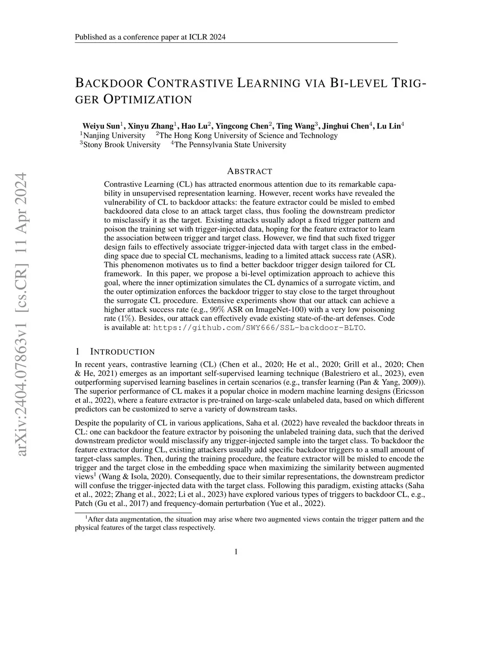 Backdoor Contrastive Learning via Bi-level Trigger Optimization