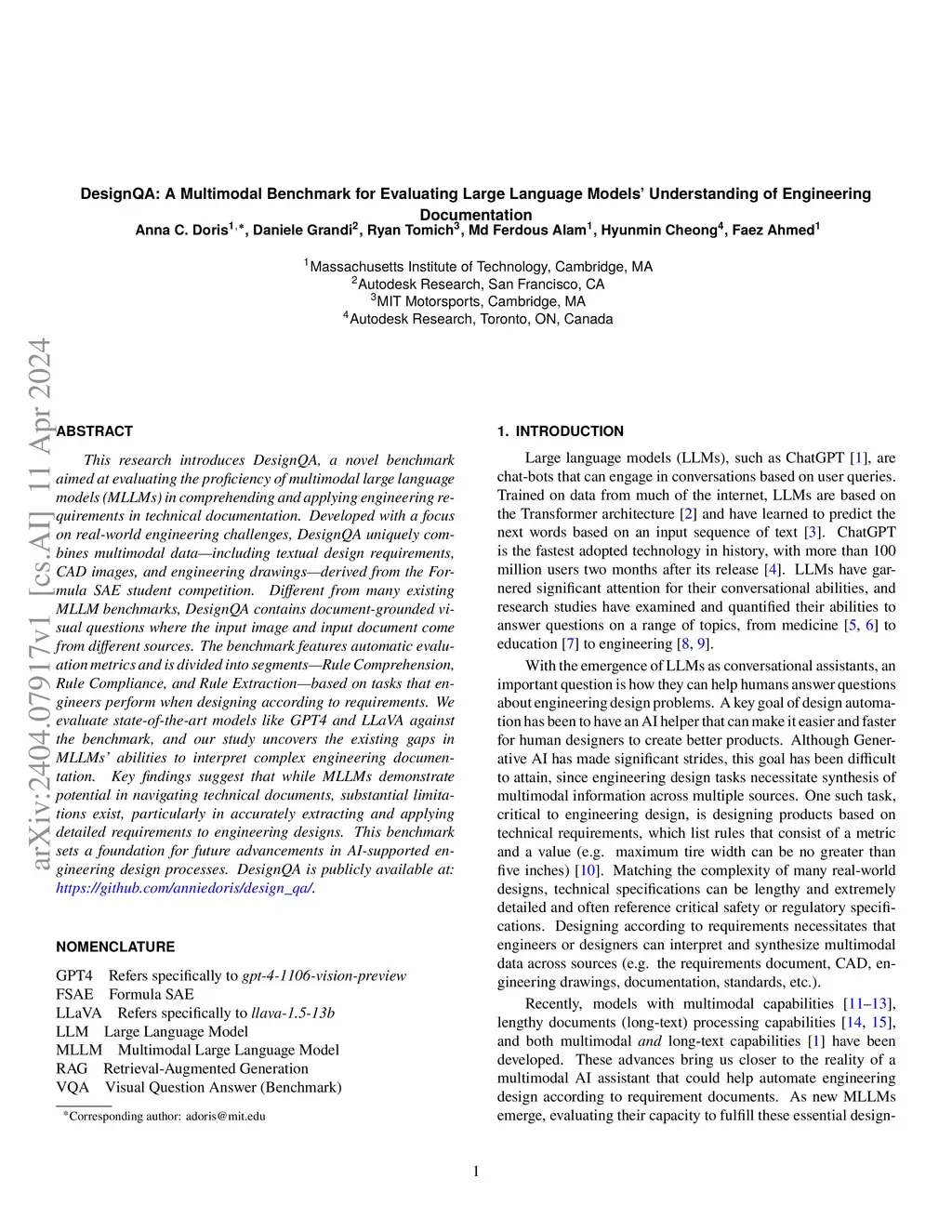 DesignQA: A Multimodal Benchmark for Evaluating Large Language Models'