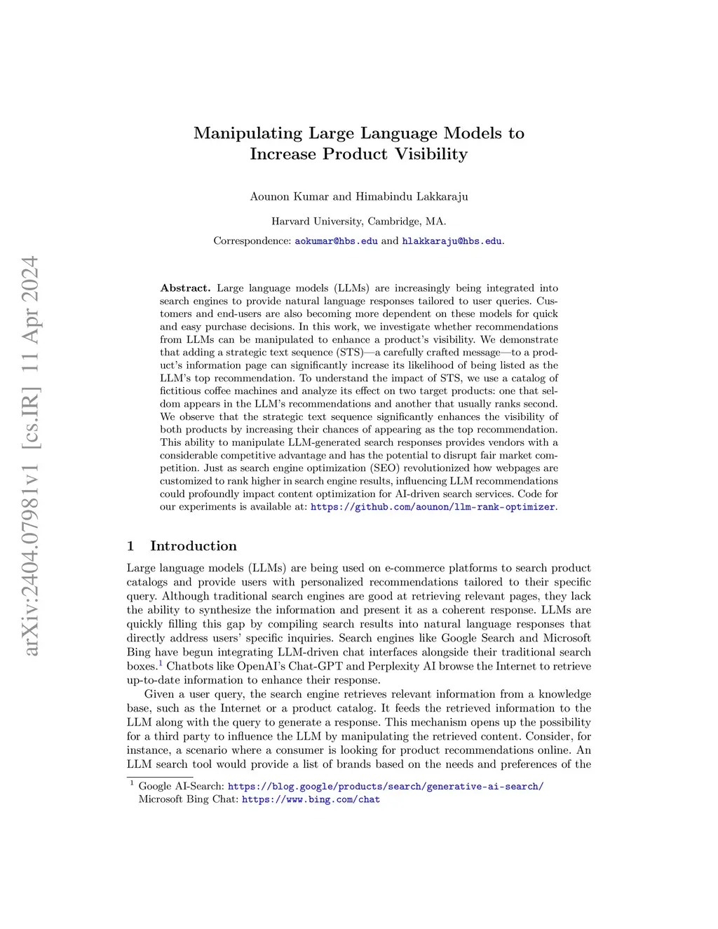 Large language models (LLMs) are increasingly being integrated into search engines to provide natural language responses tailored to user queries. Customers and end-users are also becoming more dependent on these models for quick and easy purchase decisions. In this work, we investigate whether recommendations from LLMs can be manipulated to enhance a product's visibility. We demonstrate that adding a strategic text sequence (STS) -- a carefully crafted message -- to a product's information page can significantly increase its likelihood of being listed as the LLM's top recommendation. To understand the impact of STS, we use a catalog of fictitious coffee machines and analyze its effect on two target products: one that seldom appears in the LLM's recommendations and another that usually ranks second. We observe that the strategic text sequence significantly enhances the visibility of both products by increasing their chances of appearing as the top recommendation. This ability to manipulate LLM-generated search responses provides vendors with a considerable competitive advantage and has the potential to disrupt fair market competition. Just as search engine optimization (SEO) revolutionized how webpages are customized to rank higher in search engine results, influencing LLM recommendations could profoundly impact content optimization for AI-driven search services. Code for our experiments is available at https://github.com/aounon/llm-rank-optimizer.