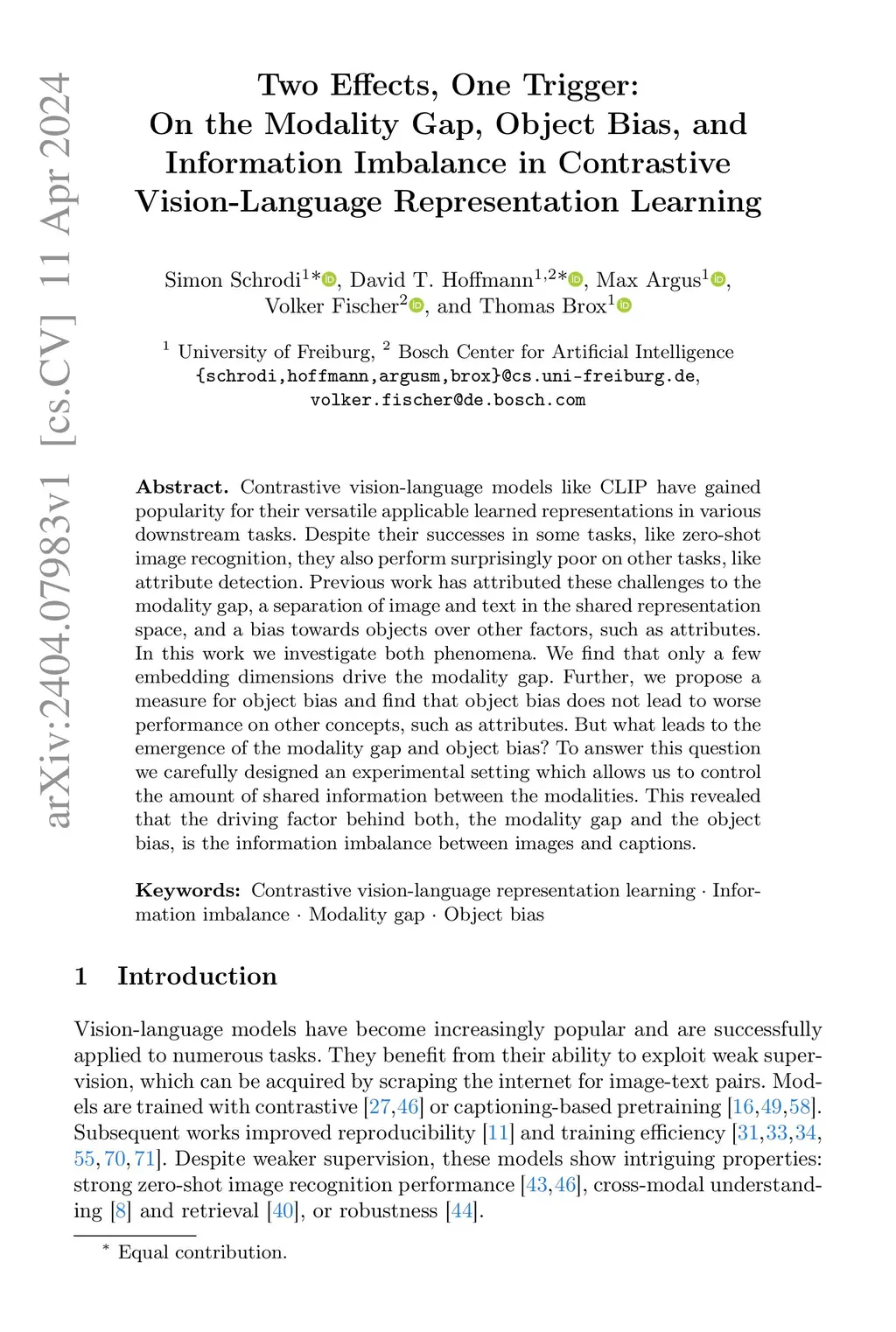 Two Effects, One Trigger: On the Modality Gap, Object Bias, and Information Imbalance in Contrastive Vision-Language Models