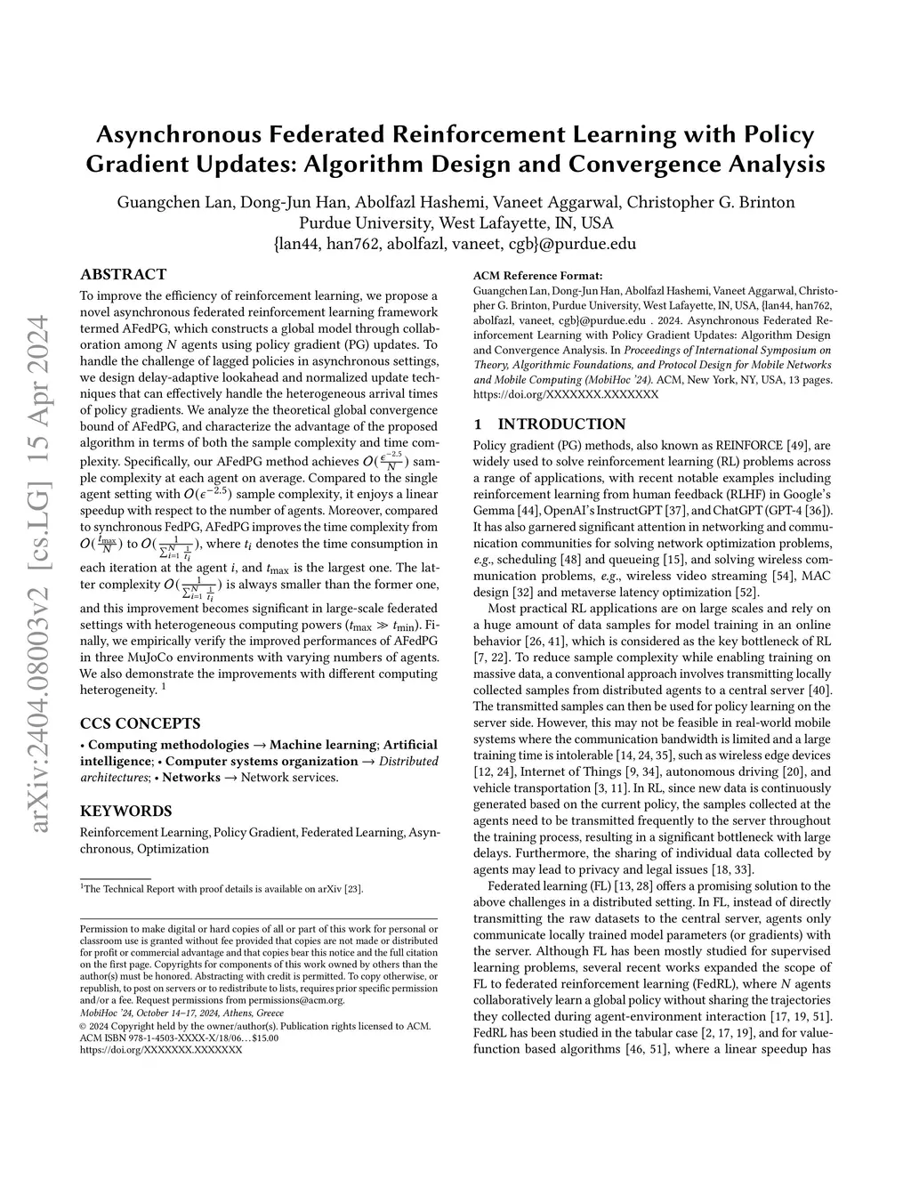 To improve the efficiency of reinforcement learning (RL), we propose a novel asynchronous federated reinforcement learning (FedRL) framework termed AFedPG, which constructs a global model through collaboration among agents using policy gradient (PG) updates. To address the challenge of lagged policies in asynchronous settings, we design a delay-adaptive lookahead technique \textit{specifically for FedRL} that can effectively handle heterogeneous arrival times of policy gradients. We analyze the theoretical global convergence bound of AFedPG, and characterize the advantage of the proposed algorithm in terms of both the sample complexity and time complexity. Specifically, our AFedPG method achieves sample complexity for global convergence at each agent on average. Compared to the single agent setting with sample complexity, it enjoys a linear speedup with respect to the number of agents. Moreover, compared to synchronous FedPG, AFedPG improves the time complexity from to , where denotes the time consumption in each iteration at agent , and is the largest one. The latter complexity is always smaller than the former one, and this improvement becomes significant in large-scale federated settings with heterogeneous computing powers (). Finally, we empirically verify the improved performance of AFedPG in four widely used MuJoCo environments with varying numbers of agents. We also demonstrate the advantages of AFedPG in various computing heterogeneity scenarios.