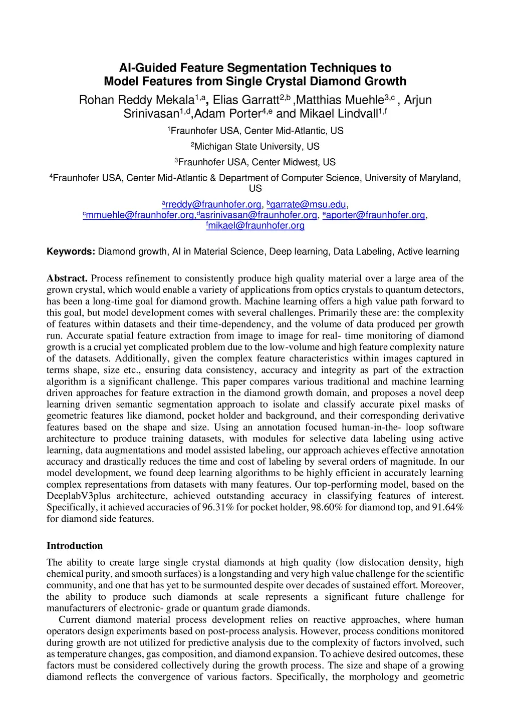 Process refinement to consistently produce high-quality material over a large area of the grown crystal, enabling various applications from optics crystals to quantum detectors, has long been a goal for diamond growth. Machine learning offers a promising path toward this goal, but faces challenges such as the complexity of features within datasets, their time-dependency, and the volume of data produced per growth run. Accurate spatial feature extraction from image to image for real-time monitoring of diamond growth is crucial yet complicated due to the low-volume and high feature complexity nature of the datasets. This paper compares various traditional and machine learning-driven approaches for feature extraction in the diamond growth domain, proposing a novel deep learning-driven semantic segmentation approach to isolate and classify accurate pixel masks of geometric features like diamond, pocket holder, and background, along with their derivative features based on shape and size. Using an annotation-focused human-in-the-loop software architecture for training datasets, with modules for selective data labeling using active learning, data augmentations, and model-assisted labeling, our approach achieves effective annotation accuracy and drastically reduces labeling time and cost. Deep learning algorithms prove highly efficient in accurately learning complex representations from datasets with many features. Our top-performing model, based on the DeeplabV3plus architecture, achieves outstanding accuracy in classifying features of interest, with accuracies of 96.31% for pocket holder, 98.60% for diamond top, and 91.64% for diamond side features.