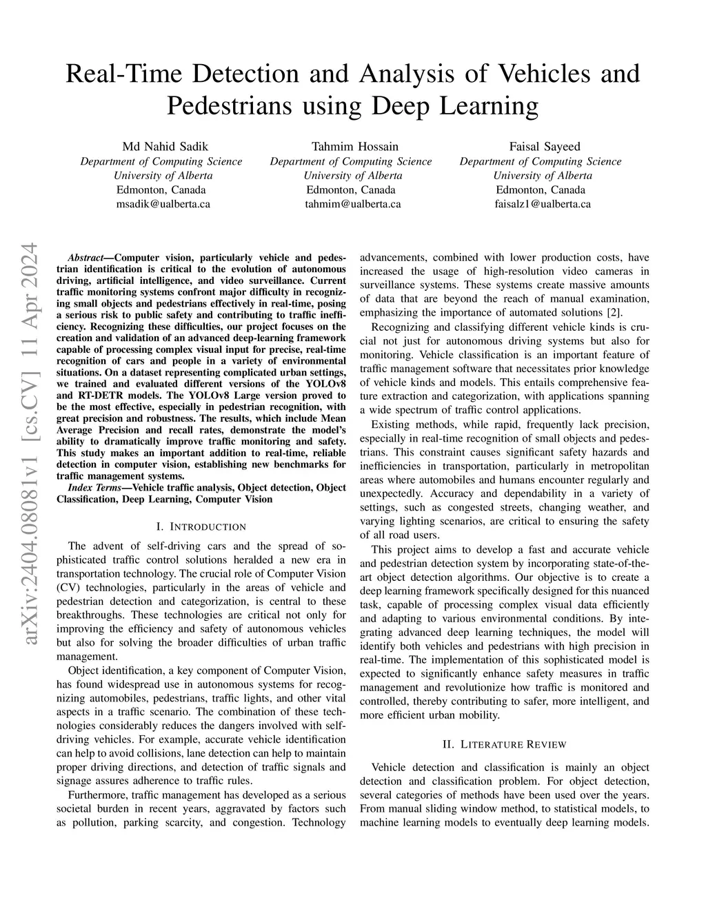 Computer vision, particularly vehicle and pedestrian identification is critical to the evolution of autonomous driving, artificial intelligence, and video surveillance. Current traffic monitoring systems confront major difficulty in recognizing small objects and pedestrians effectively in real-time, posing a serious risk to public safety and contributing to traffic inefficiency. Recognizing these difficulties, our project focuses on the creation and validation of an advanced deep-learning framework capable of processing complex visual input for precise, real-time recognition of cars and people in a variety of environmental situations. On a dataset representing complicated urban settings, we trained and evaluated different versions of the YOLOv8 and RT-DETR models. The YOLOv8 Large version proved to be the most effective, especially in pedestrian recognition, with great precision and robustness. The results, which include Mean Average Precision and recall rates, demonstrate the model's ability to dramatically improve traffic monitoring and safety. This study makes an important addition to real-time, reliable detection in computer vision, establishing new benchmarks for traffic management systems.