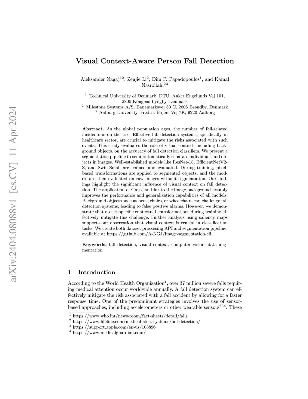 As the global population ages, the number of fall-related incidents is on the rise. Effective fall detection systems, specifically in healthcare sector, are crucial to mitigate the risks associated with such events. This study evaluates the role of visual context, including background objects, on the accuracy of fall detection classifiers. We present a segmentation pipeline to semi-automatically separate individuals and objects in images. Well-established models like ResNet-18, EfficientNetV2-S, and Swin-Small are trained and evaluated. During training, pixel-based transformations are applied to segmented objects, and the models are then evaluated on raw images without segmentation. Our findings highlight the significant influence of visual context on fall detection. The application of Gaussian blur to the image background notably improves the performance and generalization capabilities of all models. Background objects such as beds, chairs, or wheelchairs can challenge fall detection systems, leading to false positive alarms. However, we demonstrate that object-specific contextual transformations during training effectively mitigate this challenge. Further analysis using saliency maps supports our observation that visual context is crucial in classification tasks. We create both dataset processing API and segmentation pipeline, available at https://github.com/A-NGJ/image-segmentation-cli.