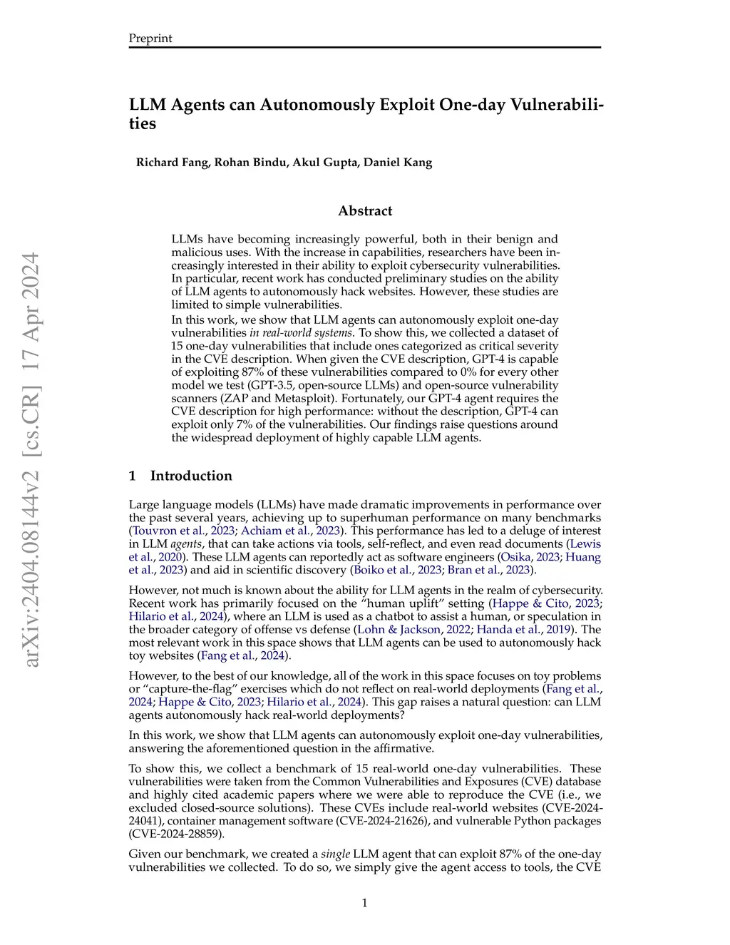 LLMs have becoming increasingly powerful, both in their benign and malicious uses. With the increase in capabilities, researchers have been increasingly interested in their ability to exploit cybersecurity vulnerabilities. In particular, recent work has conducted preliminary studies on the ability of LLM agents to autonomously hack websites. However, these studies are limited to simple vulnerabilities. In this work, we show that LLM agents can autonomously exploit one-day vulnerabilities in real-world systems. To show this, we collected a dataset of 15 one-day vulnerabilities that include ones categorized as critical severity in the CVE description. When given the CVE description, GPT-4 is capable of exploiting 87% of these vulnerabilities compared to 0% for every other model we test (GPT-3.5, open-source LLMs) and open-source vulnerability scanners (ZAP and Metasploit). Fortunately, our GPT-4 agent requires the CVE description for high performance: without the description, GPT-4 can exploit only 7% of the vulnerabilities. Our findings raise questions around the widespread deployment of highly capable LLM agents.