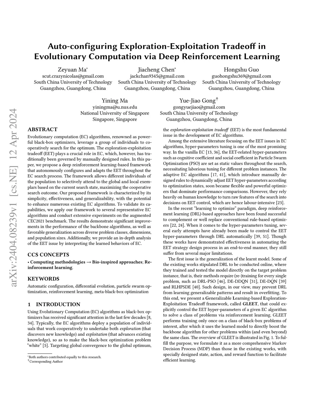 Evolutionary computation (EC) algorithms, renowned as powerful black-box optimizers, leverage a group of individuals to cooperatively search for the optimum. The exploration-exploitation tradeoff (EET) plays a crucial role in EC, which, however, has traditionally been governed by manually designed rules. In this paper, we propose a deep reinforcement learning-based framework that autonomously configures and adapts the EET throughout the EC search process. The framework allows different individuals of the population to selectively attend to the global and local exemplars based on the current search state, maximizing the cooperative search outcome. Our proposed framework is characterized by its simplicity, effectiveness, and generalizability, with the potential to enhance numerous existing EC algorithms. To validate its capabilities, we apply our framework to several representative EC algorithms and conduct extensive experiments on the augmented CEC2021 benchmark. The results demonstrate significant improvements in the performance of the backbone algorithms, as well as favorable generalization across diverse problem classes, dimensions, and population sizes. Additionally, we provide an in-depth analysis of the EET issue by interpreting the learned behaviors of EC.