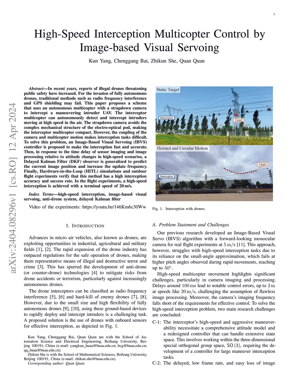 In recent years, reports of illegal drones threatening public safety have increased. For the invasion of fully autonomous drones, traditional methods such as radio frequency interference and GPS shielding may fail. This paper proposes a scheme that uses an autonomous multicopter with a strapdown camera to intercept a maneuvering intruder UAV. The interceptor multicopter can autonomously detect and intercept intruders moving at high speed in the air. The strapdown camera avoids the complex mechanical structure of the electro-optical pod, making the interceptor multicopter compact. However, the coupling of the camera and multicopter motion makes interception tasks difficult. To solve this problem, an Image-Based Visual Servoing (IBVS) controller is proposed to make the interception fast and accurate. Then, in response to the time delay of sensor imaging and image processing relative to attitude changes in high-speed scenarios, a Delayed Kalman Filter (DKF) observer is generalized to predict the current image position and increase the update frequency. Finally, Hardware-in-the-Loop (HITL) simulations and outdoor flight experiments verify that this method has a high interception accuracy and success rate. In the flight experiments, a high-speed interception is achieved with a terminal speed of 20 m/s.