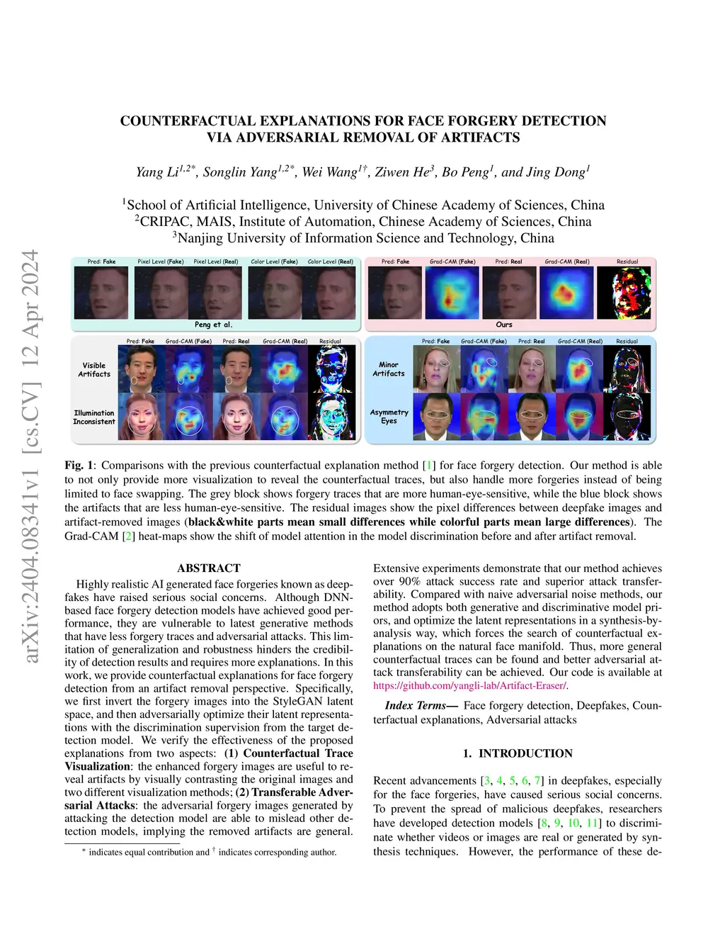 Highly realistic AI generated face forgeries known as deepfakes have raised serious social concerns. Although DNN-based face forgery detection models have achieved good performance, they are vulnerable to latest generative methods that have less forgery traces and adversarial attacks. This limitation of generalization and robustness hinders the credibility of detection results and requires more explanations. In this work, we provide counterfactual explanations for face forgery detection from an artifact removal perspective. Specifically, we first invert the forgery images into the StyleGAN latent space, and then adversarially optimize their latent representations with the discrimination supervision from the target detection model. We verify the effectiveness of the proposed explanations from two aspects: (1) Counterfactual Trace Visualization: the enhanced forgery images are useful to reveal artifacts by visually contrasting the original images and two different visualization methods; (2) Transferable Adversarial Attacks: the adversarial forgery images generated by attacking the detection model are able to mislead other detection models, implying the removed artifacts are general. Extensive experiments demonstrate that our method achieves over 90% attack success rate and superior attack transferability. Compared with naive adversarial noise methods, our method adopts both generative and discriminative model priors, and optimize the latent representations in a synthesis-by-analysis way, which forces the search of counterfactual explanations on the natural face manifold. Thus, more general counterfactual traces can be found and better adversarial attack transferability can be achieved.