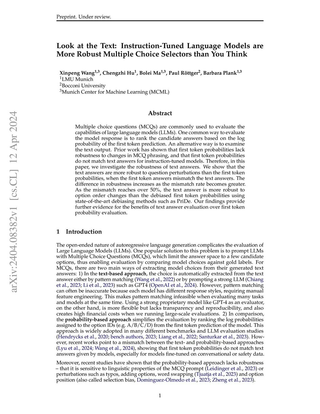 Multiple choice questions (MCQs) are commonly used to evaluate the capabilities of large language models (LLMs). One common way to evaluate the model response is to rank the candidate answers based on the log probability of the first token prediction. An alternative way is to examine the text output. Prior work has shown that first token probabilities lack robustness to changes in MCQ phrasing, and that first token probabilities do not match text answers for instruction-tuned models. Therefore, in this paper, we investigate the robustness of text answers. We show that the text answers are more robust to question perturbations than the first token probabilities, when the first token answers mismatch the text answers. The difference in robustness increases as the mismatch rate becomes greater. As the mismatch reaches over 50\%, the text answer is more robust to option order changes than the debiased first token probabilities using state-of-the-art debiasing methods such as PriDe. Our findings provide further evidence for the benefits of text answer evaluation over first token probability evaluation.