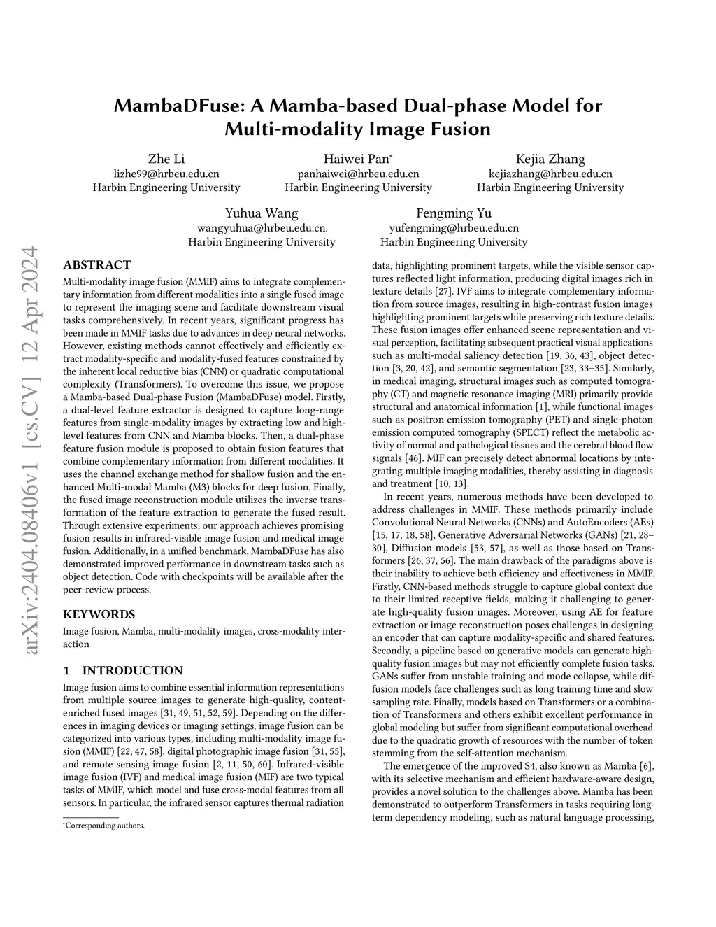Multi-modality image fusion (MMIF) aims to integrate complementary information from different modalities into a single fused image to represent the imaging scene and facilitate downstream visual tasks comprehensively. In recent years, significant progress has been made in MMIF tasks due to advances in deep neural networks. However, existing methods cannot effectively and efficiently extract modality-specific and modality-fused features constrained by the inherent local reductive bias (CNN) or quadratic computational complexity (Transformers). To overcome this issue, we propose a Mamba-based Dual-phase Fusion (MambaDFuse) model. Firstly, a dual-level feature extractor is designed to capture long-range features from single-modality images by extracting low and high-level features from CNN and Mamba blocks. Then, a dual-phase feature fusion module is proposed to obtain fusion features that combine complementary information from different modalities. It uses the channel exchange method for shallow fusion and the enhanced Multi-modal Mamba (M3) blocks for deep fusion. Finally, the fused image reconstruction module utilizes the inverse transformation of the feature extraction to generate the fused result. Through extensive experiments, our approach achieves promising fusion results in infrared-visible image fusion and medical image fusion. Additionally, in a unified benchmark, MambaDFuse has also demonstrated improved performance in downstream tasks such as object detection. Code with checkpoints will be available after the peer-review process.