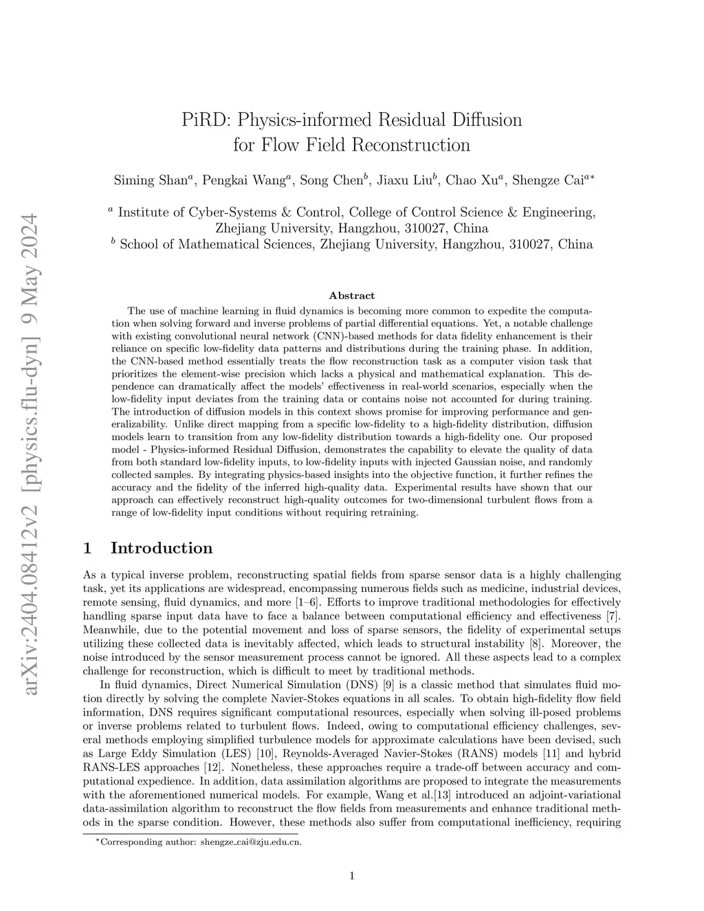 The use of machine learning in fluid dynamics is becoming more common to expedite the computation when solving forward and inverse problems of partial differential equations. Yet, a notable challenge with existing convolutional neural network (CNN)-based methods for data fidelity enhancement is their reliance on specific low-fidelity data patterns and distributions during the training phase. In addition, the CNN-based method essentially treats the flow reconstruction task as a computer vision task that prioritizes the element-wise precision which lacks a physical and mathematical explanation. This dependence can dramatically affect the models' effectiveness in real-world scenarios, especially when the low-fidelity input deviates from the training data or contains noise not accounted for during training. The introduction of diffusion models in this context shows promise for improving performance and generalizability. Unlike direct mapping from a specific low-fidelity to a high-fidelity distribution, diffusion models learn to transition from any low-fidelity distribution towards a high-fidelity one. Our proposed model - Physics-informed Residual Diffusion, demonstrates the capability to elevate the quality of data from both standard low-fidelity inputs, to low-fidelity inputs with injected Gaussian noise, and randomly collected samples. By integrating physics-based insights into the objective function, it further refines the accuracy and the fidelity of the inferred high-quality data. Experimental results have shown that our approach can effectively reconstruct high-quality outcomes for two-dimensional turbulent flows from a range of low-fidelity input conditions without requiring retraining.