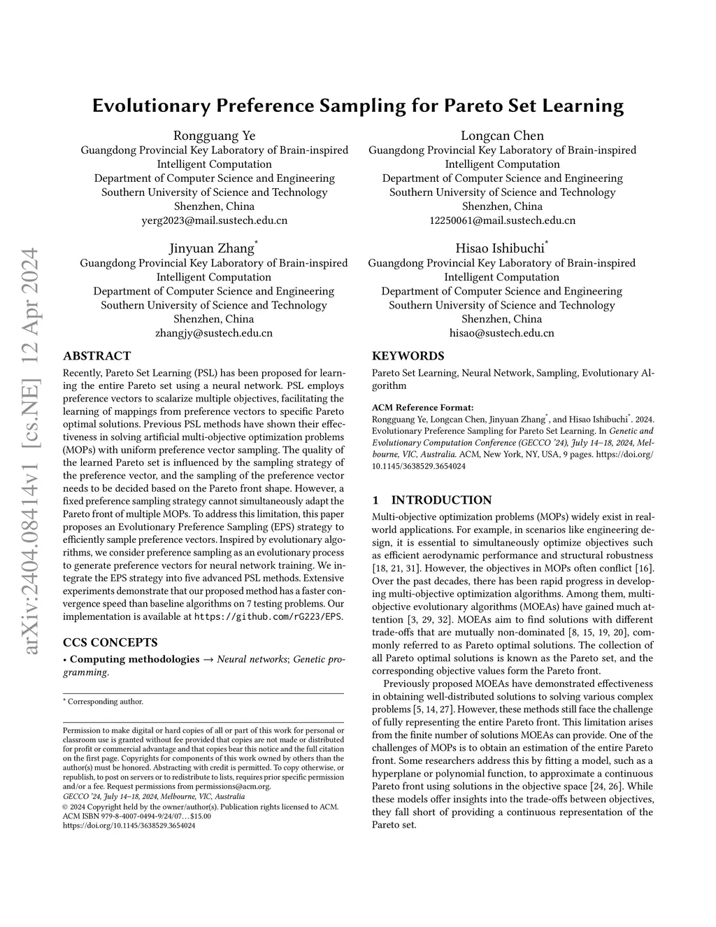 Recently, Pareto Set Learning (PSL) has been proposed for learning the entire Pareto set using a neural network. PSL employs preference vectors to scalarize multiple objectives, facilitating the learning of mappings from preference vectors to specific Pareto optimal solutions. Previous PSL methods have shown their effectiveness in solving artificial multi-objective optimization problems (MOPs) with uniform preference vector sampling. The quality of the learned Pareto set is influenced by the sampling strategy of the preference vector, and the sampling of the preference vector needs to be decided based on the Pareto front shape. However, a fixed preference sampling strategy cannot simultaneously adapt the Pareto front of multiple MOPs. To address this limitation, this paper proposes an Evolutionary Preference Sampling (EPS) strategy to efficiently sample preference vectors. Inspired by evolutionary algorithms, we consider preference sampling as an evolutionary process to generate preference vectors for neural network training. We integrate the EPS strategy into five advanced PSL methods. Extensive experiments demonstrate that our proposed method has a faster convergence speed than baseline algorithms on 7 testing problems. Our implementation is available at https://github.com/rG223/EPS.