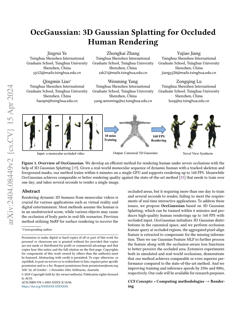 OccGaussian: 3D Gaussian Splatting for Occluded Human Rendering