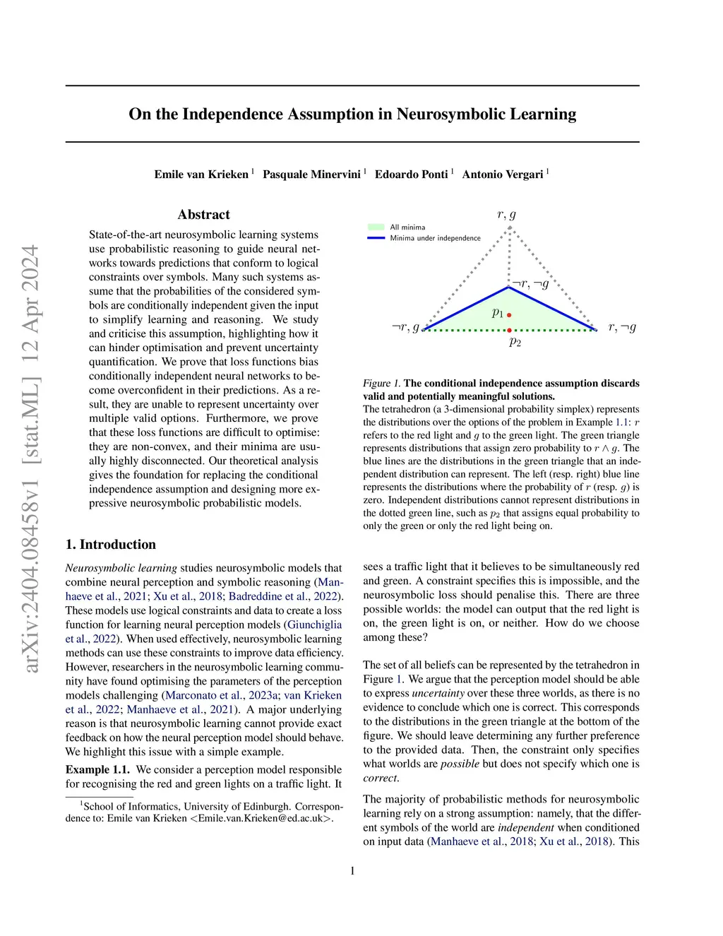 State-of-the-art neurosymbolic learning systems use probabilistic reasoning to guide neural networks towards predictions that conform to logical constraints over symbols. Many such systems assume that the probabilities of the considered symbols are conditionally independent given the input to simplify learning and reasoning. We study and criticise this assumption, highlighting how it can hinder optimisation and prevent uncertainty quantification. We prove that loss functions bias conditionally independent neural networks to become overconfident in their predictions. As a result, they are unable to represent uncertainty over multiple valid options. Furthermore, we prove that these loss functions are difficult to optimise: they are non-convex, and their minima are usually highly disconnected. Our theoretical analysis gives the foundation for replacing the conditional independence assumption and designing more expressive neurosymbolic probabilistic models.