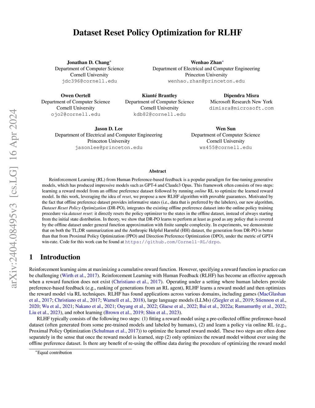 Reinforcement Learning (RL) from Human Preference-based feedback is a popular paradigm for fine-tuning generative models, which has produced impressive models such as GPT-4 and Claude3 Opus. This framework often consists of two steps: learning a reward model from an offline preference dataset followed by running online RL to optimize the learned reward model. In this work, leveraging the idea of reset, we propose a new RLHF algorithm with provable guarantees. Motivated by the fact that offline preference dataset provides informative states (i.e., data that is preferred by the labelers), our new algorithm, Dataset Reset Policy Optimization (DR-PO), integrates the existing offline preference dataset into the online policy training procedure via dataset reset: it directly resets the policy optimizer to the states in the offline dataset, instead of always starting from the initial state distribution. In theory, we show that DR-PO learns to perform at least as good as any policy that is covered by the offline dataset under general function approximation with finite sample complexity. In experiments, we demonstrate that on both the TL;DR summarization and the Anthropic Helpful Harmful (HH) dataset, the generation from DR-PO is better than that from Proximal Policy Optimization (PPO) and Direction Preference Optimization (DPO), under the metric of GPT4 win-rate. Code for this work can be found at https://github.com/Cornell-RL/drpo.