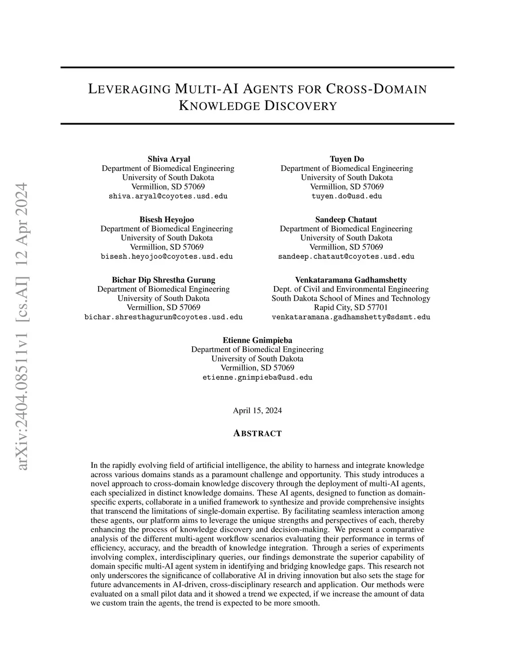 In the rapidly evolving field of artificial intelligence, the ability to harness and integrate knowledge across various domains stands as a paramount challenge and opportunity. This study introduces a novel approach to cross-domain knowledge discovery through the deployment of multi-AI agents, each specialized in distinct knowledge domains. These AI agents, designed to function as domain-specific experts, collaborate in a unified framework to synthesize and provide comprehensive insights that transcend the limitations of single-domain expertise. By facilitating seamless interaction among these agents, our platform aims to leverage the unique strengths and perspectives of each, thereby enhancing the process of knowledge discovery and decision-making. We present a comparative analysis of the different multi-agent workflow scenarios evaluating their performance in terms of efficiency, accuracy, and the breadth of knowledge integration. Through a series of experiments involving complex, interdisciplinary queries, our findings demonstrate the superior capability of domain specific multi-AI agent system in identifying and bridging knowledge gaps. This research not only underscores the significance of collaborative AI in driving innovation but also sets the stage for future advancements in AI-driven, cross-disciplinary research and application. Our methods were evaluated on a small pilot data and it showed a trend we expected, if we increase the amount of data we custom train the agents, the trend is expected to be more smooth.