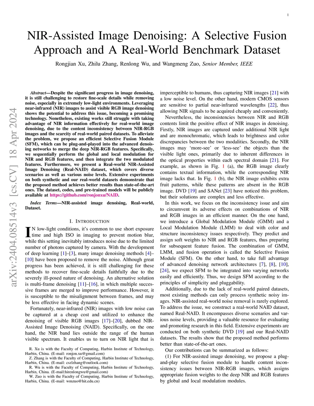 Despite the significant progress in image denoising, it is still challenging to restore fine-scale details while removing noise, especially in extremely low-light environments. Leveraging near-infrared (NIR) images to assist visible RGB image denoising shows the potential to address this issue, becoming a promising technology. Nonetheless, existing works still struggle with taking advantage of NIR information effectively for real-world image denoising, due to the content inconsistency between NIR-RGB images and the scarcity of real-world paired datasets. To alleviate the problem, we propose an efficient Selective Fusion Module (SFM), which can be plug-and-played into the advanced denoising networks to merge the deep NIR-RGB features. Specifically, we sequentially perform the global and local modulation for NIR and RGB features, and then integrate the two modulated features. Furthermore, we present a Real-world NIR-Assisted Image Denoising (Real-NAID) dataset, which covers diverse scenarios as well as various noise levels. Extensive experiments on both synthetic and our real-world datasets demonstrate that the proposed method achieves better results than state-of-the-art ones. The dataset, codes, and pre-trained models will be publicly available atthis https URL.