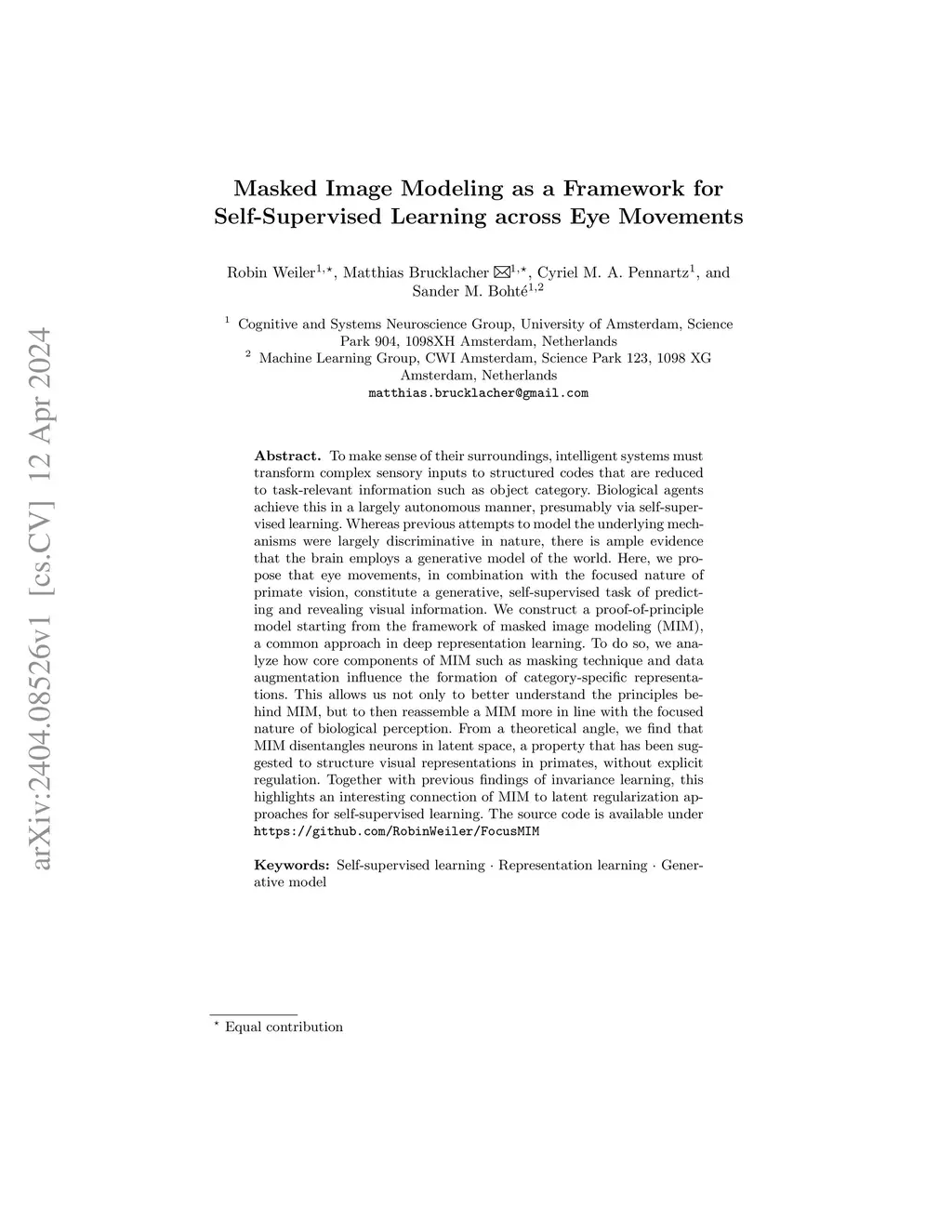 To make sense of their surroundings, intelligent systems must transform complex sensory inputs to structured codes that are reduced to task-relevant information such as object category. Biological agents achieve this in a largely autonomous manner, presumably via self-supervised learning. Whereas previous attempts to model the underlying mechanisms were largely discriminative in nature, there is ample evidence that the brain employs a generative model of the world. Here, we propose that eye movements, in combination with the focused nature of primate vision, constitute a generative, self-supervised task of predicting and revealing visual information. We construct a proof-of-principle model starting from the framework of masked image modeling (MIM), a common approach in deep representation learning. To do so, we analyze how core components of MIM such as masking technique and data augmentation influence the formation of category-specific representations. This allows us not only to better understand the principles behind MIM, but to then reassemble a MIM more in line with the focused nature of biological perception. We find that MIM disentangles neurons in latent space without explicit regularization, a property that has been suggested to structure visual representations in primates. Together with previous findings of invariance learning, this highlights an interesting connection of MIM to latent regularization approaches for self-supervised learning. The source code is available under https://github.com/RobinWeiler/FocusMIM