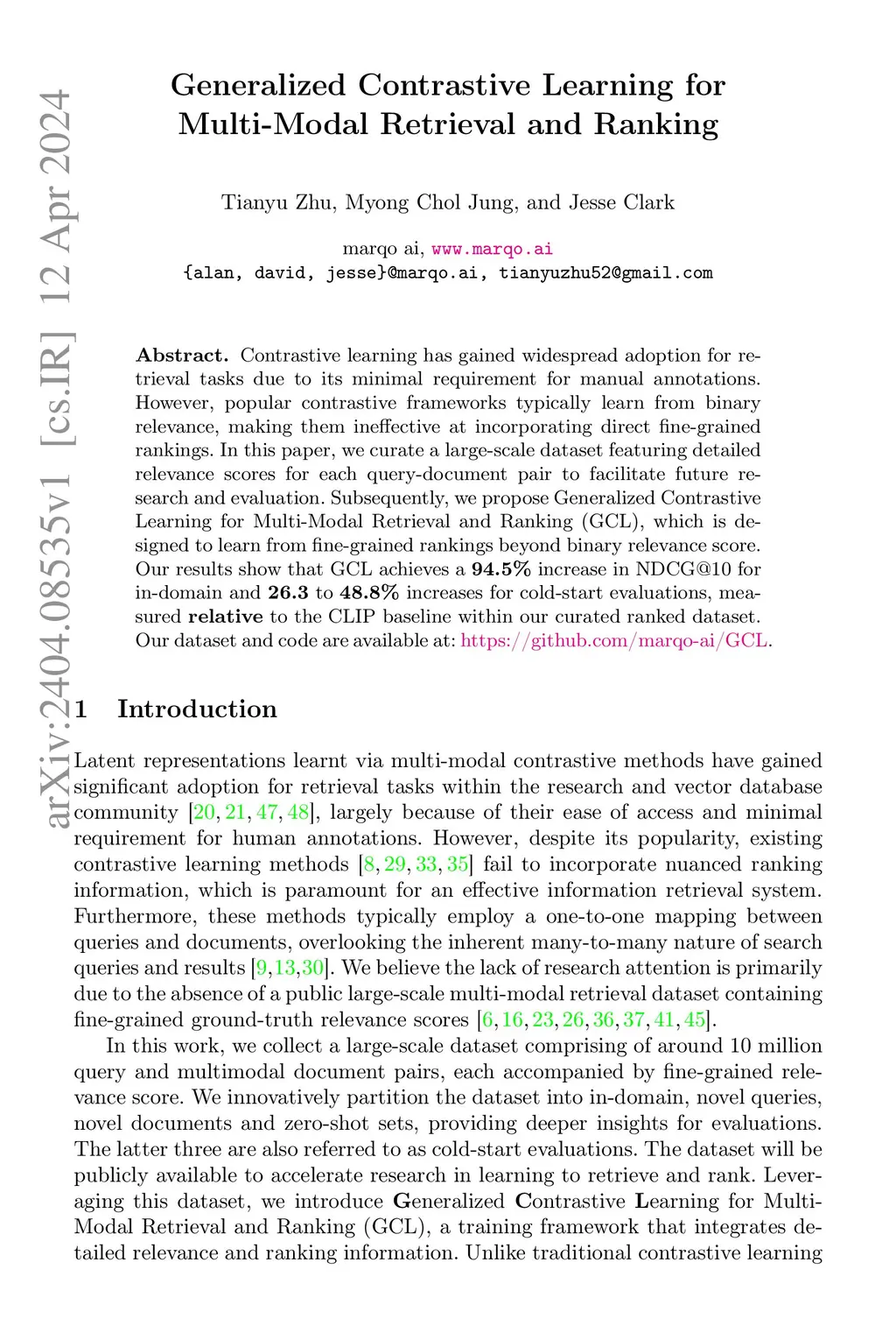 Contrastive learning has gained widespread adoption for retrieval tasks due to its minimal requirement for manual annotations. However, popular training frameworks typically learn from binary (positive/negative) relevance, making them ineffective at incorporating desired rankings. As a result, the poor ranking performance of these models forces systems to employ a re-ranker, which increases complexity, maintenance effort and inference time. To address this, we introduce Generalized Contrastive Learning (GCL), a training framework designed to learn from continuous ranking scores beyond binary relevance. GCL encodes both relevance and ranking information into a unified embedding space by applying ranking scores to the loss function. This enables a single-stage retrieval system. In addition, during our research, we identified a lack of public multi-modal datasets that benchmark both retrieval and ranking capabilities. To facilitate this and future research for ranked retrieval, we curated a large-scale MarqoGS-10M dataset using GPT-4 and Google Shopping, providing ranking scores for each of the 10 million query-document pairs. Our results show that GCL achieves a 29.3% increase in NDCG@10 for in-domain evaluations and 6.0% to 10.0% increases for cold-start evaluations compared to the finetuned CLIP baseline with MarqoGS-10M. Additionally, we evaluated GCL offline on a proprietary user interaction data. GCL shows an 11.2% gain for in-domain evaluations. The dataset and the method are available at:this https URL.