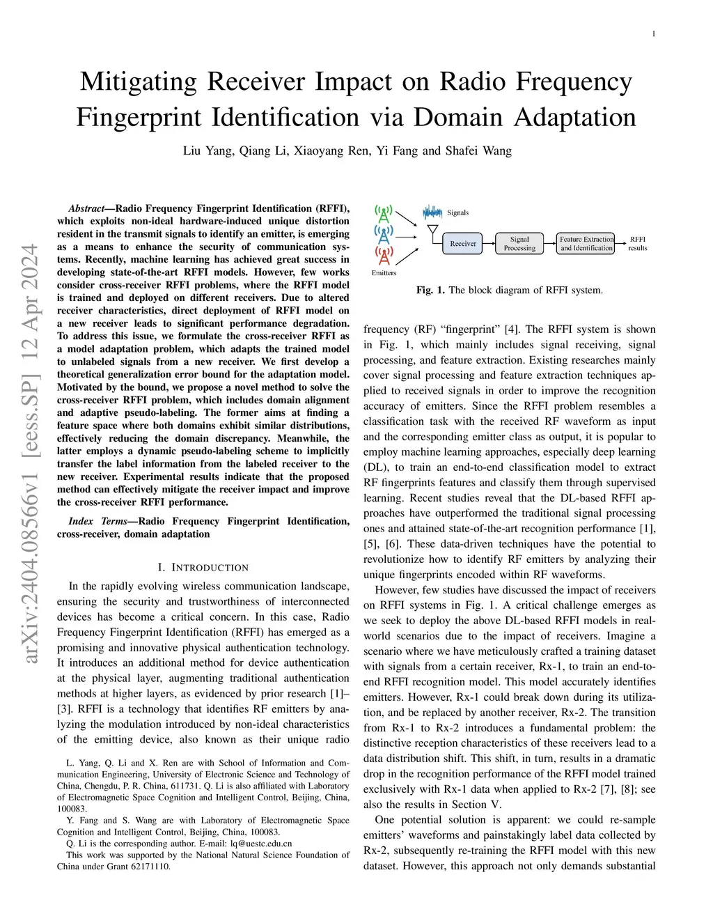 Radio Frequency Fingerprint Identification (RFFI), which exploits non-ideal hardware-induced unique distortion resident in the transmit signals to identify an emitter, is emerging as a means to enhance the security of communication systems. Recently, machine learning has achieved great success in developing state-of-the-art RFFI models. However, few works consider cross-receiver RFFI problems, where the RFFI model is trained and deployed on different receivers. Due to altered receiver characteristics, direct deployment of RFFI model on a new receiver leads to significant performance degradation. To address this issue, we formulate the cross-receiver RFFI as a model adaptation problem, which adapts the trained model to unlabeled signals from a new receiver. We first develop a theoretical generalization error bound for the adaptation model. Motivated by the bound, we propose a novel method to solve the cross-receiver RFFI problem, which includes domain alignment and adaptive pseudo-labeling. The former aims at finding a feature space where both domains exhibit similar distributions, effectively reducing the domain discrepancy. Meanwhile, the latter employs a dynamic pseudo-labeling scheme to implicitly transfer the label information from the labeled receiver to the new receiver. Experimental results indicate that the proposed method can effectively mitigate the receiver impact and improve the cross-receiver RFFI performance.