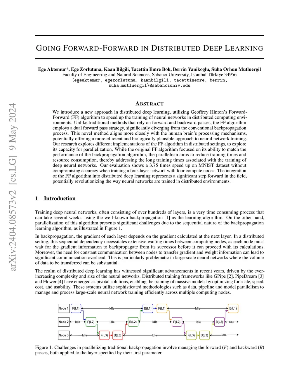 We introduce a new approach in distributed deep learning, utilizing Geoffrey Hinton's Forward-Forward (FF) algorithm to speed up the training of neural networks in distributed computing environments. Unlike traditional methods that rely on forward and backward passes, the FF algorithm employs a dual forward pass strategy, significantly diverging from the conventional backpropagation process. This novel method aligns more closely with the human brain's processing mechanisms, potentially offering a more efficient and biologically plausible approach to neural network training. Our research explores different implementations of the FF algorithm in distributed settings, to explore its capacity for parallelization. While the original FF algorithm focused on its ability to match the performance of the backpropagation algorithm, the parallelism aims to reduce training times and resource consumption, thereby addressing the long training times associated with the training of deep neural networks. Our evaluation shows a 3.75 times speed up on MNIST dataset without compromising accuracy when training a four-layer network with four compute nodes. The integration of the FF algorithm into distributed deep learning represents a significant step forward in the field, potentially revolutionizing the way neural networks are trained in distributed environments.