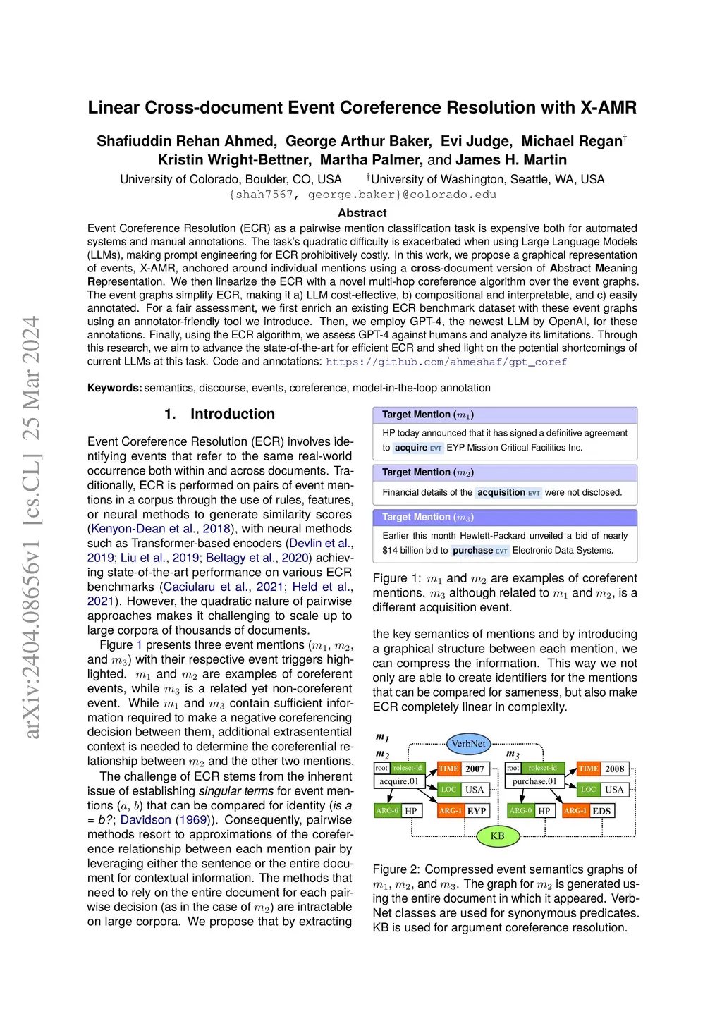 Event Coreference Resolution (ECR) as a pairwise mention classification task is expensive both for automated systems and manual annotations. The task's quadratic difficulty is exacerbated when using Large Language Models (LLMs), making prompt engineering for ECR prohibitively costly. In this work, we propose a graphical representation of events, X-AMR, anchored around individual mentions using a \textbf{cross}-document version of \textbf{A}bstract \textbf{M}eaning \textbf{R}epresentation. We then linearize the ECR with a novel multi-hop coreference algorithm over the event graphs. The event graphs simplify ECR, making it a) LLM cost-effective, b) compositional and interpretable, and c) easily annotated. For a fair assessment, we first enrich an existing ECR benchmark dataset with these event graphs using an annotator-friendly tool we introduce. Then, we employ GPT-4, the newest LLM by OpenAI, for these annotations. Finally, using the ECR algorithm, we assess GPT-4 against humans and analyze its limitations. Through this research, we aim to advance the state-of-the-art for efficient ECR and shed light on the potential shortcomings of current LLMs at this task. Code and annotations: \url{https://github.com/ahmeshaf/gpt_coref}