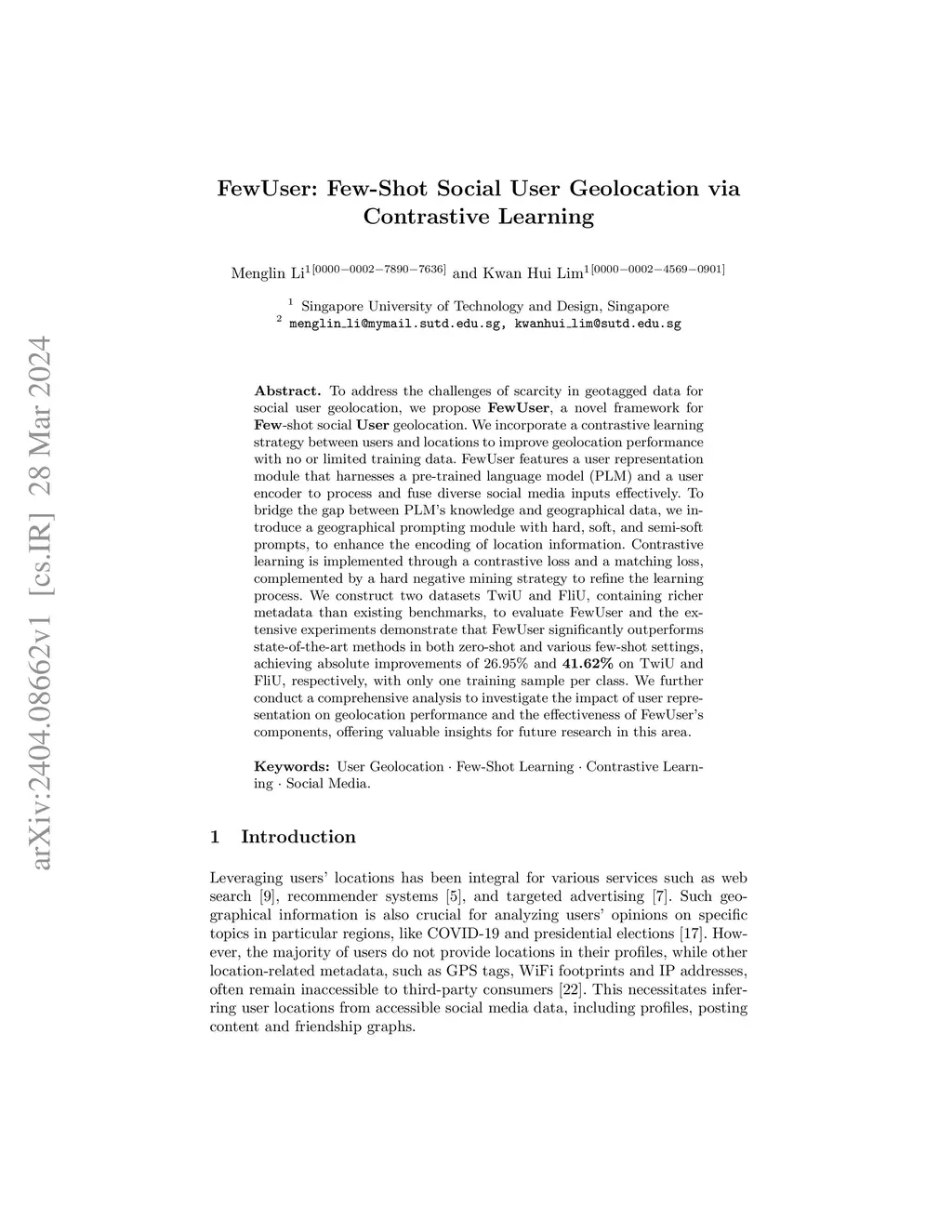 FewUser: Few-Shot Social User Geolocation via Contrastive Learning