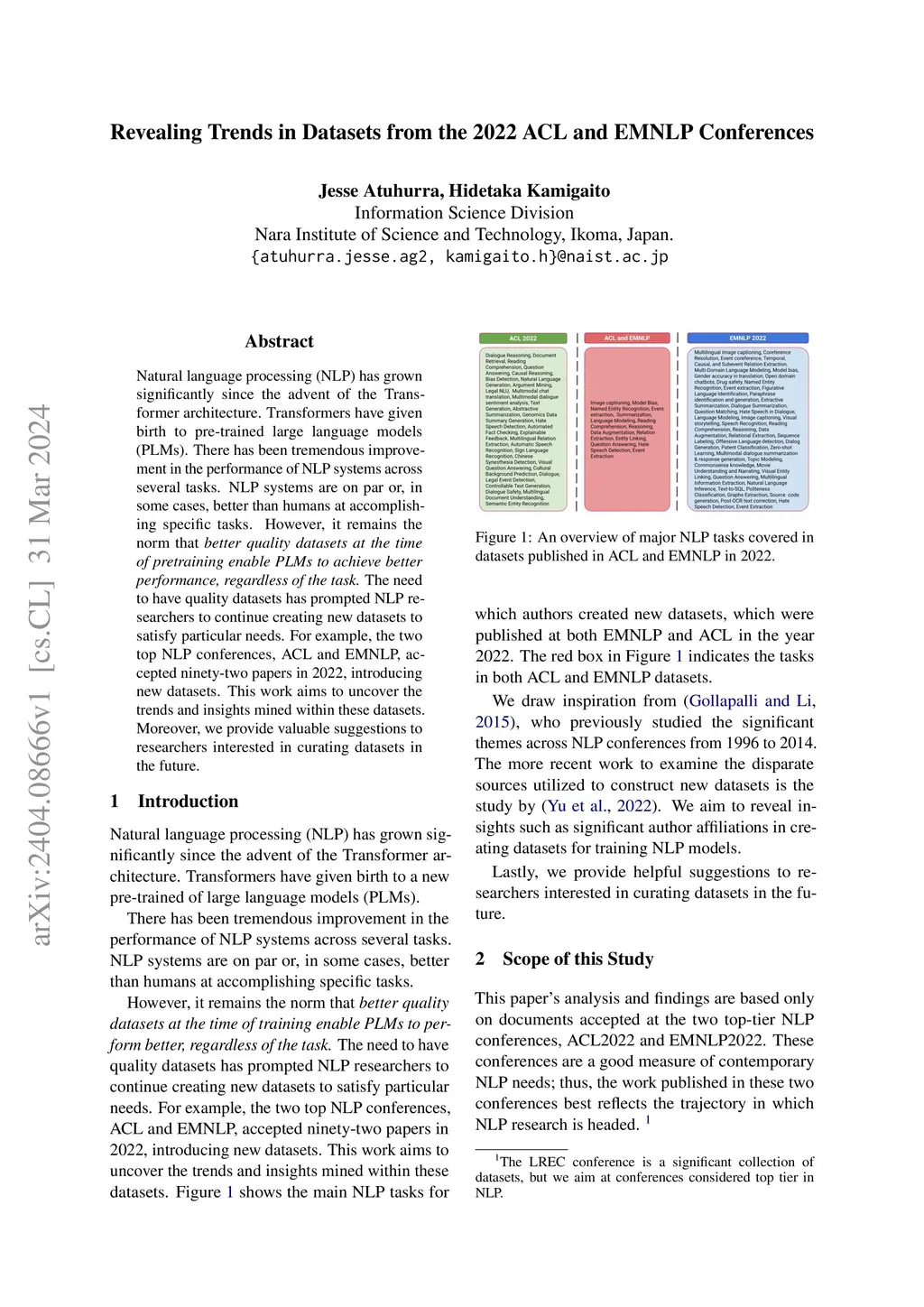 Natural language processing (NLP) has grown significantly since the advent of the Transformer architecture. Transformers have given birth to pre-trained large language models (PLMs). There has been tremendous improvement in the performance of NLP systems across several tasks. NLP systems are on par or, in some cases, better than humans at accomplishing specific tasks. However, it remains the norm that \emph{better quality datasets at the time of pretraining enable PLMs to achieve better performance, regardless of the task.} The need to have quality datasets has prompted NLP researchers to continue creating new datasets to satisfy particular needs. For example, the two top NLP conferences, ACL and EMNLP, accepted ninety-two papers in 2022, introducing new datasets. This work aims to uncover the trends and insights mined within these datasets. Moreover, we provide valuable suggestions to researchers interested in curating datasets in the future.
