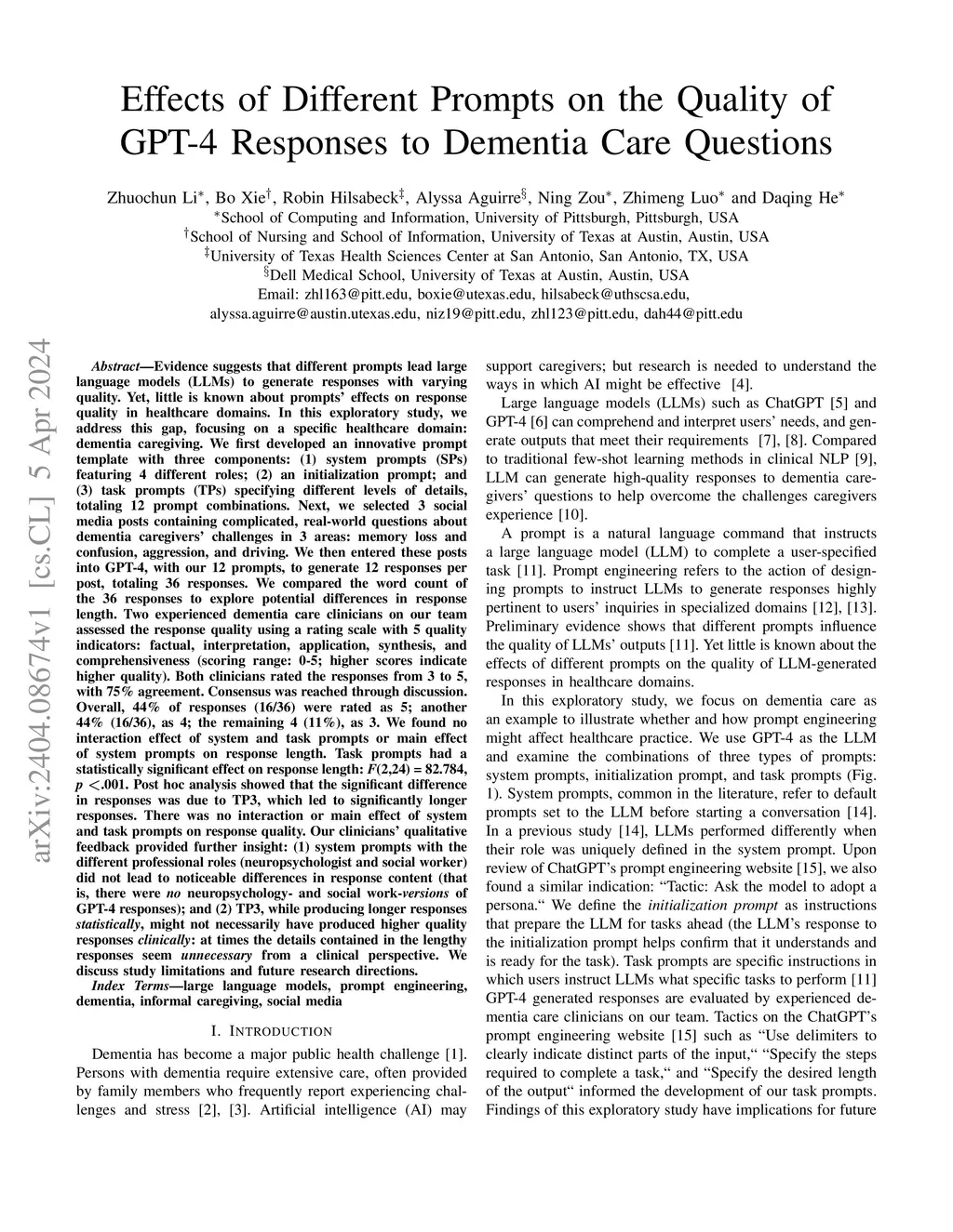 Evidence suggests that different prompts lead large language models (LLMs) to generate responses with varying quality. Yet, little is known about prompts' effects on response quality in healthcare domains. In this exploratory study, we address this gap, focusing on a specific healthcare domain: dementia caregiving. We first developed an innovative prompt template with three components: (1) system prompts (SPs) featuring 4 different roles; (2) an initialization prompt; and (3) task prompts (TPs) specifying different levels of details, totaling 12 prompt combinations. Next, we selected 3 social media posts containing complicated, real-world questions about dementia caregivers' challenges in 3 areas: memory loss and confusion, aggression, and driving. We then entered these posts into GPT-4, with our 12 prompts, to generate 12 responses per post, totaling 36 responses. We compared the word count of the 36 responses to explore potential differences in response length. Two experienced dementia care clinicians on our team assessed the response quality using a rating scale with 5 quality indicators: factual, interpretation, application, synthesis, and comprehensiveness (scoring range: 0-5; higher scores indicate higher quality).