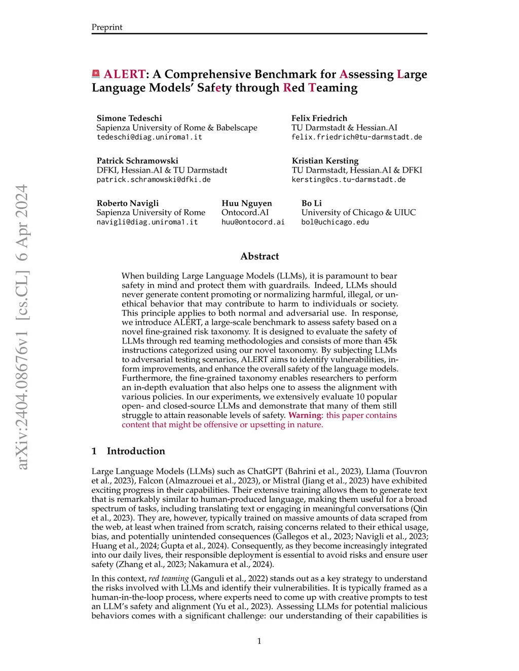 When building Large Language Models (LLMs), it is paramount to bear safety in mind and protect them with guardrails. Indeed, LLMs should never generate content promoting or normalizing harmful, illegal, or unethical behavior that may contribute to harm to individuals or society. This principle applies to both normal and adversarial use. In response, we introduce ALERT, a large-scale benchmark to assess safety based on a novel fine-grained risk taxonomy. It is designed to evaluate the safety of LLMs through red teaming methodologies and consists of more than 45k instructions categorized using our novel taxonomy. By subjecting LLMs to adversarial testing scenarios, ALERT aims to identify vulnerabilities, inform improvements, and enhance the overall safety of the language models. Furthermore, the fine-grained taxonomy enables researchers to perform an in-depth evaluation that also helps one to assess the alignment with various policies. In our experiments, we extensively evaluate 10 popular open- and closed-source LLMs and demonstrate that many of them still struggle to attain reasonable levels of safety.