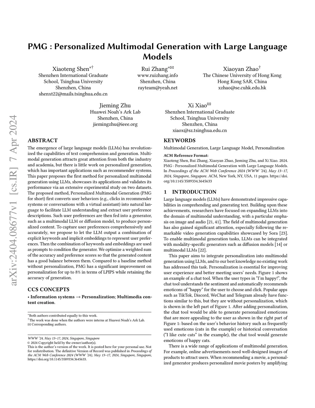 The emergence of large language models (LLMs) has revolutionized the capabilities of text comprehension and generation. Multi-modal generation attracts great attention from both the industry and academia, but there is little work on personalized generation, which has important applications such as recommender systems. This paper proposes the first method for personalized multimodal generation using LLMs, showcases its applications and validates its performance via an extensive experimental study on two datasets. The proposed method, Personalized Multimodal Generation (PMG for short) first converts user behaviors (e.g., clicks in recommender systems or conversations with a virtual assistant) into natural language to facilitate LLM understanding and extract user preference descriptions. Such user preferences are then fed into a generator, such as a multimodal LLM or diffusion model, to produce personalized content. To capture user preferences comprehensively and accurately, we propose to let the LLM output a combination of explicit keywords and implicit embeddings to represent user preferences. Then the combination of keywords and embeddings are used as prompts to condition the generator. We optimize a weighted sum of the accuracy and preference scores so that the generated content has a good balance between them. Compared to a baseline method without personalization, PMG has a significant improvement on personalization for up to 8% in terms of LPIPS while retaining the accuracy of generation.