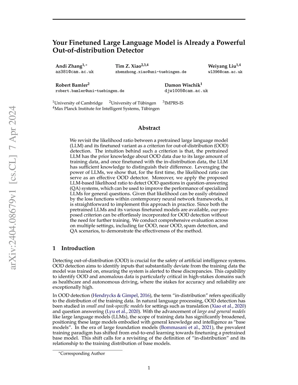 We revisit the likelihood ratio between a pretrained large language model (LLM) and its finetuned variant as a criterion for out-of-distribution (OOD) detection. The intuition behind such a criterion is that, the pretrained LLM has the prior knowledge about OOD data due to its large amount of training data, and once finetuned with the in-distribution data, the LLM has sufficient knowledge to distinguish their difference. Leveraging the power of LLMs, we show that, the likelihood ratio can serve as an effective OOD detection criterion. Moreover, we apply the proposed LLM-based likelihood ratio to detect OOD questions in question-answering (QA) systems, which can be used to improve the performance of specialized LLMs for general questions. Given that likelihood can be easily obtained by the loss functions within contemporary neural network frameworks, it is straightforward to implement this approach in practice. Since both the pretrained LLMs and its various finetuned models are widely available from online platforms such as Hugging Face, our proposed criterion can be effortlessly incorporated for OOD detection without the need for further training. We conduct comprehensive evaluation across on multiple settings, including far OOD, near OOD, spam detection, and QA scenarios, to demonstrate the effectiveness of the method. Code can be found atthis https URL
