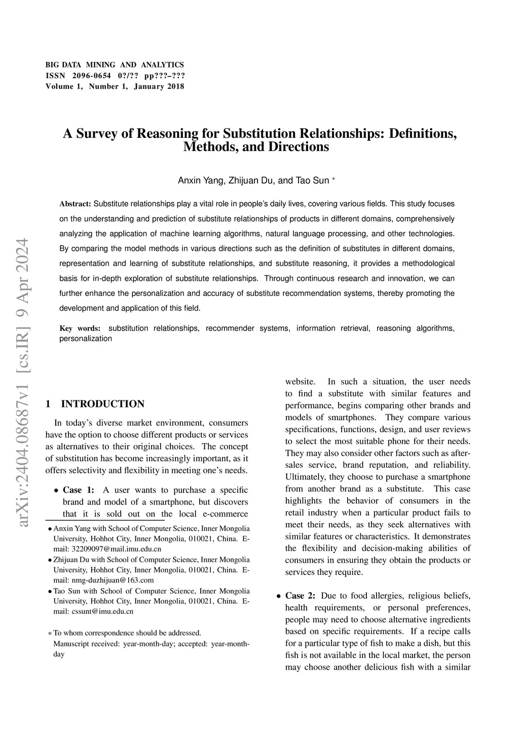 Substitute relationships are fundamental to people's daily lives across various domains. This study aims to comprehend and predict substitute relationships among products in diverse fields, extensively analyzing the application of machine learning algorithms, natural language processing, and other technologies. By comparing model methodologies across different domains, such as defining substitutes, representing and learning substitute relationships, and substitute reasoning, this study offers a methodological foundation for delving deeper into substitute relationships. Through ongoing research and innovation, we can further refine the personalization and accuracy of substitute recommendation systems, thus advancing the development and application of this field.