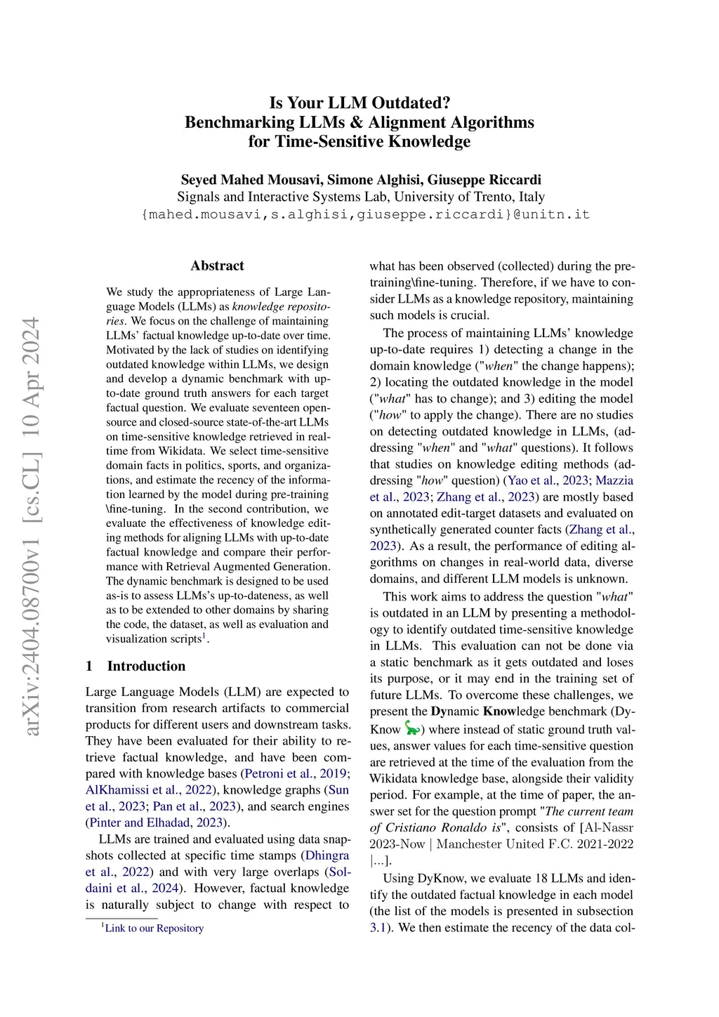 LLMs acquire knowledge from massive data snapshots collected at different timestamps. Their knowledge is then commonly evaluated using static benchmarks. However, factual knowledge is generally subject to time-sensitive changes, and static benchmarks cannot address those cases. We present an approach to dynamically evaluate the knowledge in LLMs and their time-sensitiveness against Wikidata, a publicly available up-to-date knowledge graph. We evaluate the time-sensitive knowledge in twenty-four private and open-source LLMs, as well as the effectiveness of four editing methods in updating the outdated facts. Our results show that 1) outdatedness is a critical problem across state-of-the-art LLMs; 2) LLMs output inconsistent answers when prompted with slight variations of the question prompt; and 3) the performance of the state-of-the-art knowledge editing algorithms is very limited, as they can not reduce the cases of outdatedness and output inconsistency.