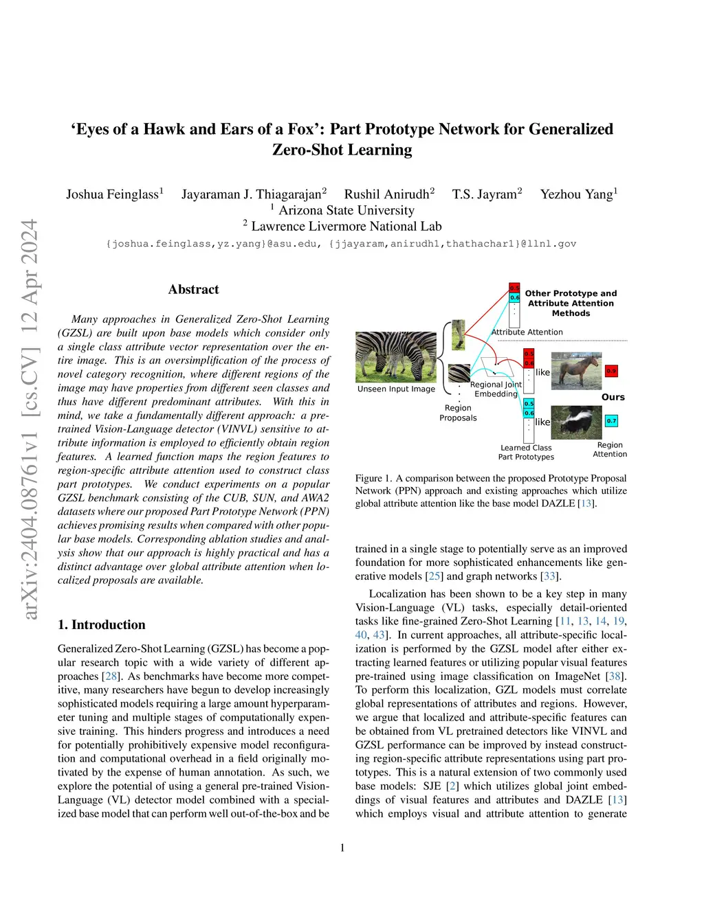 Current approaches in Generalized Zero-Shot Learning (GZSL) are built upon base models which consider only a single class attribute vector representation over the entire image. This is an oversimplification of the process of novel category recognition, where different regions of the image may have properties from different seen classes and thus have different predominant attributes. With this in mind, we take a fundamentally different approach: a pre-trained Vision-Language detector (VINVL) sensitive to attribute information is employed to efficiently obtain region features. A learned function maps the region features to region-specific attribute attention used to construct class part prototypes. We conduct experiments on a popular GZSL benchmark consisting of the CUB, SUN, and AWA2 datasets where our proposed Part Prototype Network (PPN) achieves promising results when compared with other popular base models. Corresponding ablation studies and analysis show that our approach is highly practical and has a distinct advantage over global attribute attention when localized proposals are available.