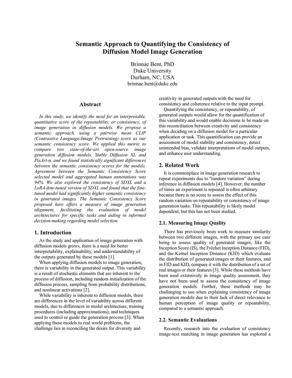 In this study, we identify the need for an interpretable, quantitative score of the repeatability, or consistency, of image generation in diffusion models. We propose a semantic approach, using a pairwise mean CLIP (Contrastive Language-Image Pretraining) score as our semantic consistency score. We applied this metric to compare two state-of-the-art open-source image generation diffusion models, Stable Diffusion XL and PixArt-{\alpha}, and we found statistically significant differences between the semantic consistency scores for the models. Agreement between the Semantic Consistency Score selected model and aggregated human annotations was 94%. We also explored the consistency of SDXL and a LoRA-fine-tuned version of SDXL and found that the fine-tuned model had significantly higher semantic consistency in generated images. The Semantic Consistency Score proposed here offers a measure of image generation alignment, facilitating the evaluation of model architectures for specific tasks and aiding in informed decision-making regarding model selection.