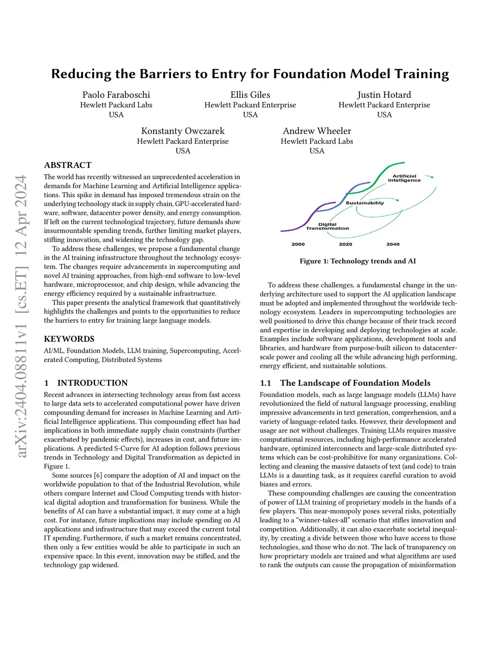 The world has recently witnessed an unprecedented acceleration in demands for Machine Learning and Artificial Intelligence applications. This spike in demand has imposed tremendous strain on the underlying technology stack in supply chain, GPU-accelerated hardware, software, datacenter power density, and energy consumption. If left on the current technological trajectory, future demands show insurmountable spending trends, further limiting market players, stifling innovation, and widening the technology gap. To address these challenges, we propose a fundamental change in the AI training infrastructure throughout the technology ecosystem. The changes require advancements in supercomputing and novel AI training approaches, from high-end software to low-level hardware, microprocessor, and chip design, while advancing the energy efficiency required by a sustainable infrastructure. This paper presents the analytical framework that quantitatively highlights the challenges and points to the opportunities to reduce the barriers to entry for training large language models.