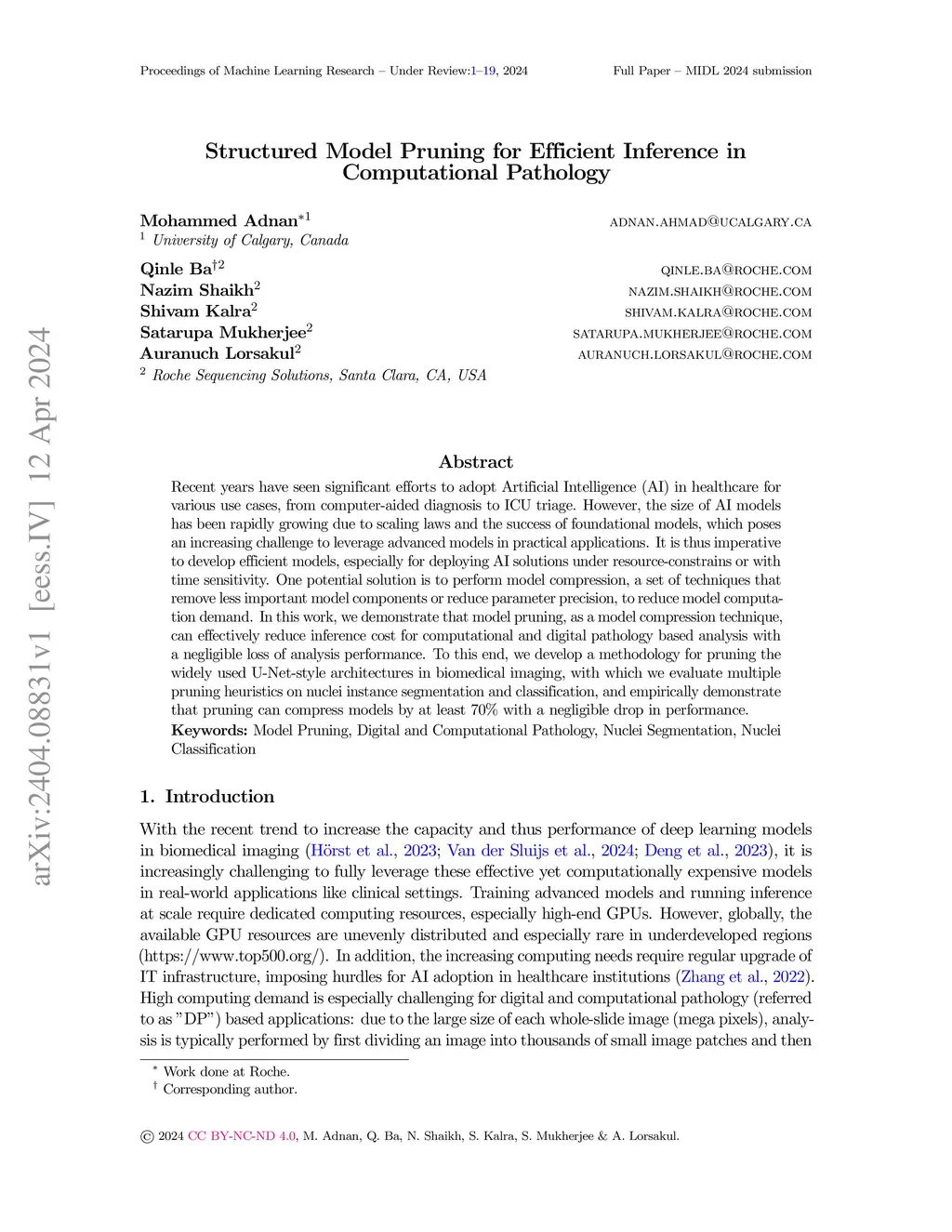 Recent years have seen significant efforts to adopt Artificial Intelligence (AI) in healthcare for various use cases, from computer-aided diagnosis to ICU triage. However, the size of AI models has been rapidly growing due to scaling laws and the success of foundational models, which poses an increasing challenge to leverage advanced models in practical applications. It is thus imperative to develop efficient models, especially for deploying AI solutions under resource-constrains or with time sensitivity. One potential solution is to perform model compression, a set of techniques that remove less important model components or reduce parameter precision, to reduce model computation demand. In this work, we demonstrate that model pruning, as a model compression technique, can effectively reduce inference cost for computational and digital pathology based analysis with a negligible loss of analysis performance. To this end, we develop a methodology for pruning the widely used U-Net-style architectures in biomedical imaging, with which we evaluate multiple pruning heuristics on nuclei instance segmentation and classification, and empirically demonstrate that pruning can compress models by at least 70% with a negligible drop in performance.